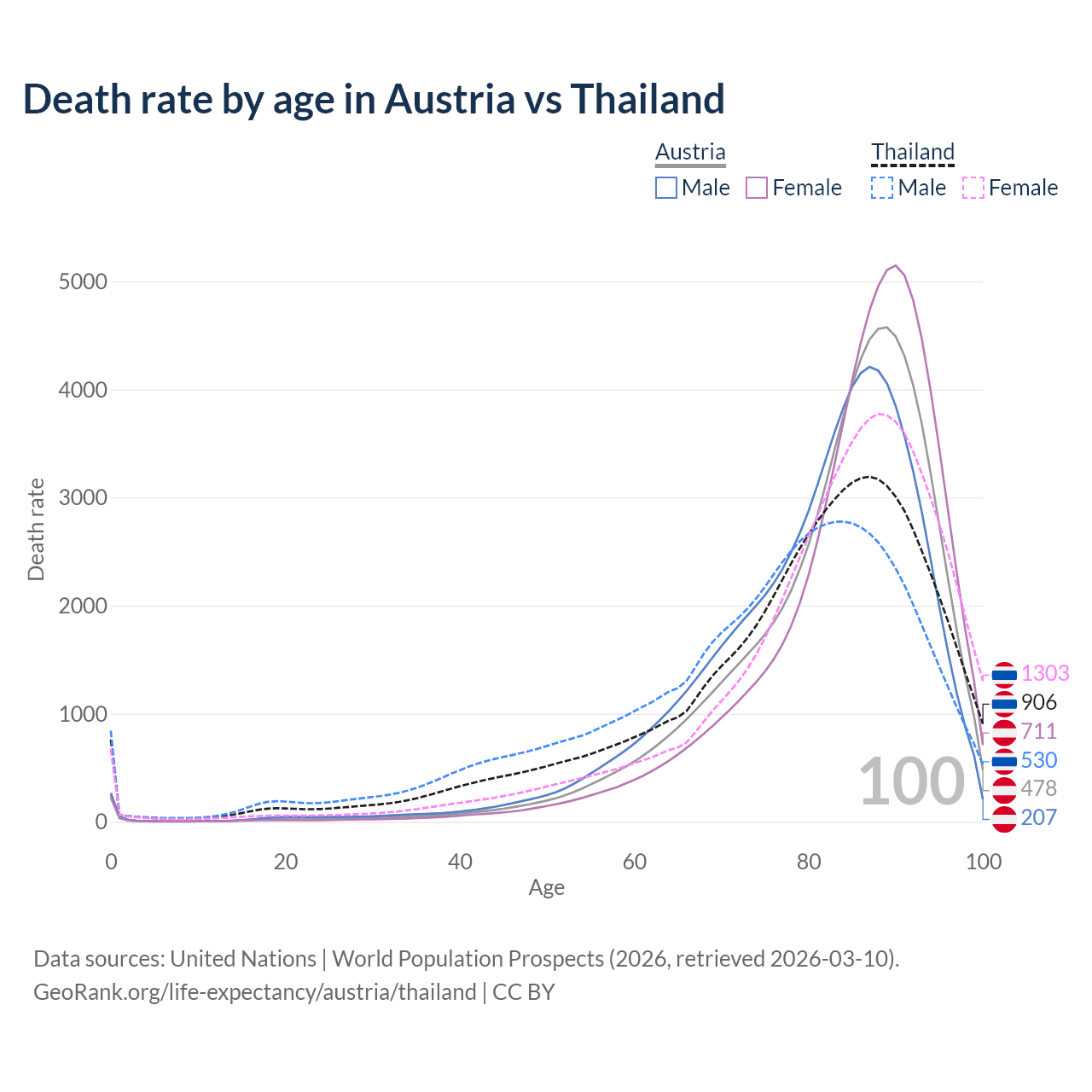 In Austria, the most common age of death is 89, compared to 87 in Thailand. The median age of death is 85.6 in Austria and 81.8 in Thailand, meaning only half of each cohort is expected to live past that age.