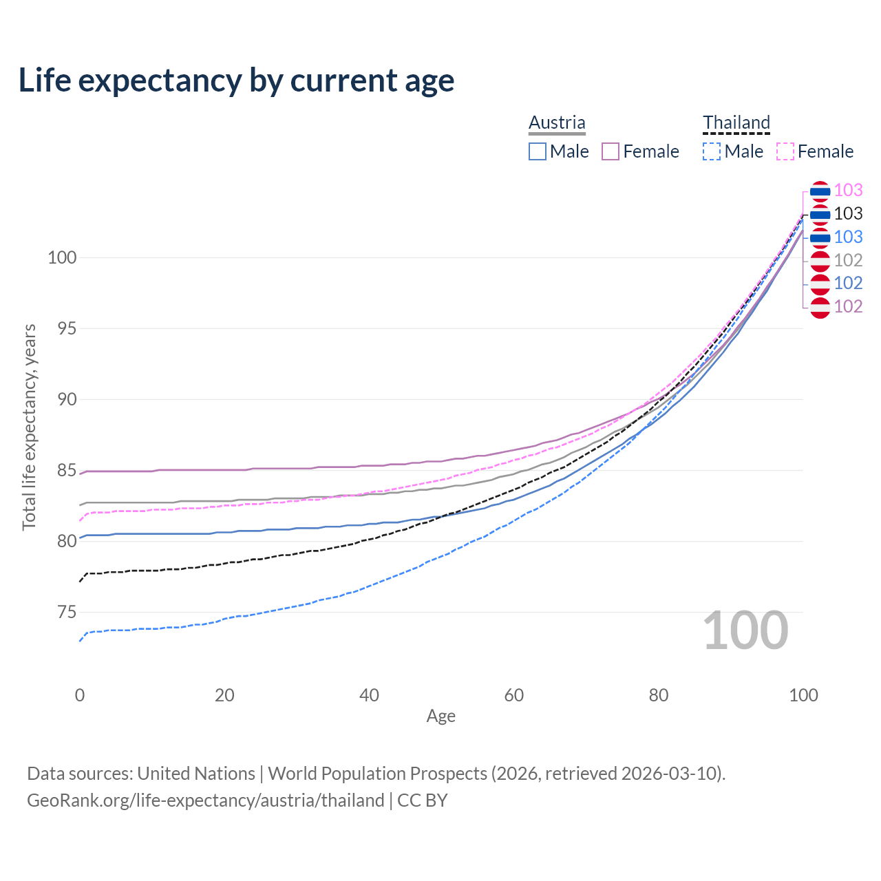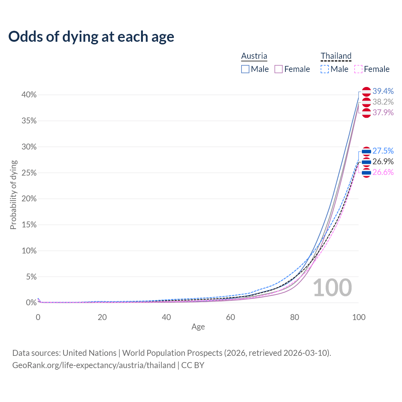 This life expectancy calculator shows the odds of living to 100, 95, 90, and below based on current age for both males and females in Austria and Thailand, along with mean and median age of death. The calculations are based on the 2026 life tables (actuarial tables) from the UN World Population Prospects.