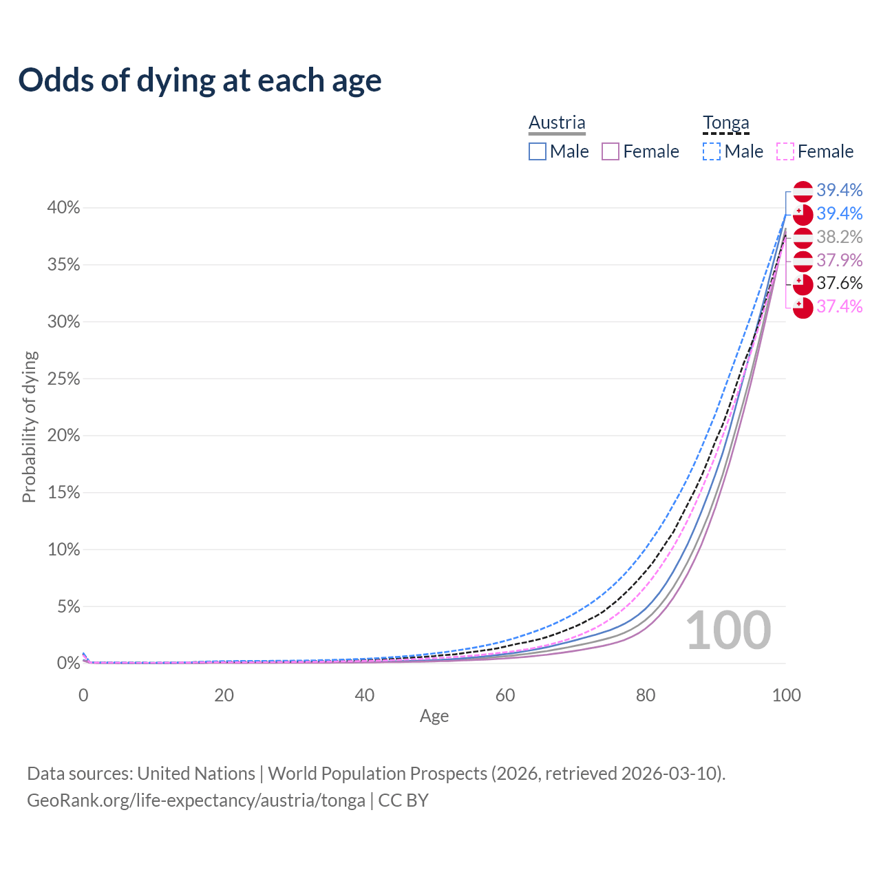 This life expectancy calculator shows the odds of living to 100, 95, 90, and below based on current age for both males and females in Austria and Tonga, along with mean and median age of death. The calculations are based on the 2026 life tables (actuarial tables) from the UN World Population Prospects.