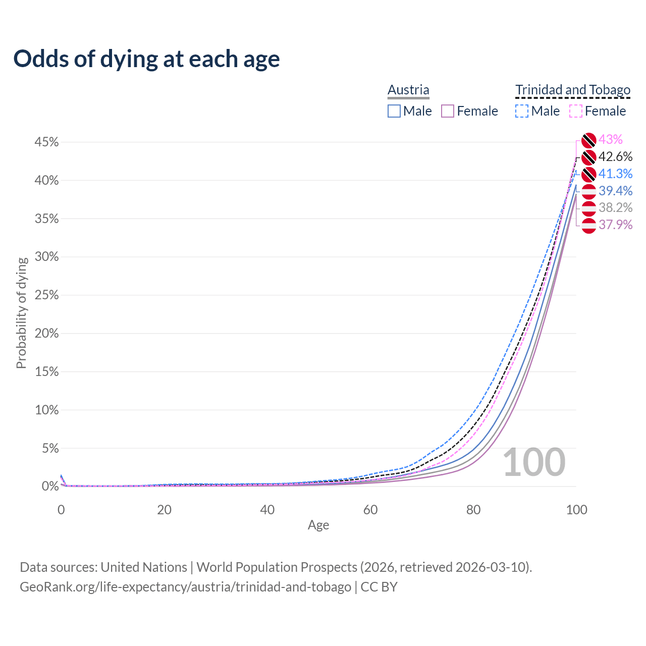 This life expectancy calculator shows the odds of living to 100, 95, 90, and below based on current age for both males and females in Austria and Trinidad and Tobago, along with mean and median age of death. The calculations are based on the 2026 life tables (actuarial tables) from the UN World Population Prospects.