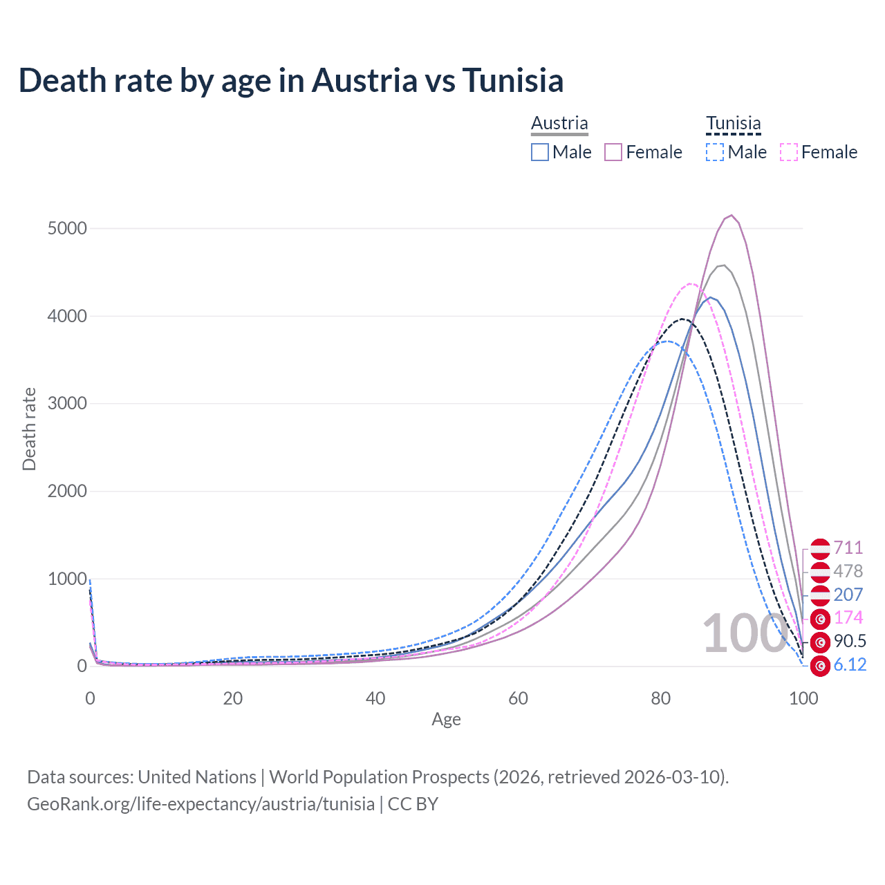 This life expectancy calculator shows the odds of living to 100, 95, 90, and below based on current age for both males and females in Austria and Tunisia, along with mean and median age of death. The calculations are based on the 2026 life tables (actuarial tables) from the UN World Population Prospects.