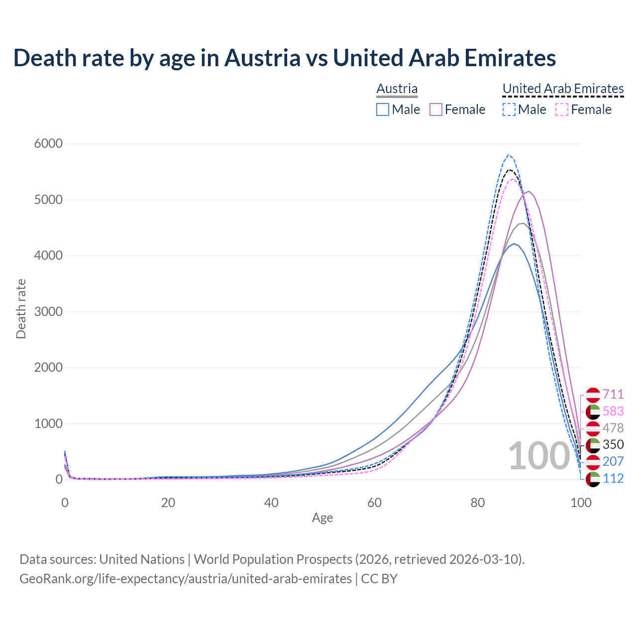 This life expectancy calculator shows the odds of living to 100, 95, 90, and below based on current age for both males and females in Austria and the United Arab Emirates, along with mean and median age of death. The calculations are based on the 2026 life tables (actuarial tables) from the UN World Population Prospects.
