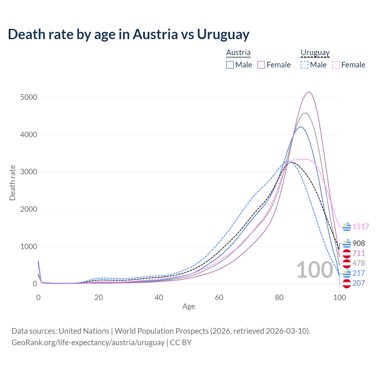 In Austria, the most common age of death is 89, compared to 84 in Uruguay. The median age of death is 85.6 in Austria and 81.8 in Uruguay, meaning only half of each cohort is expected to live past that age.