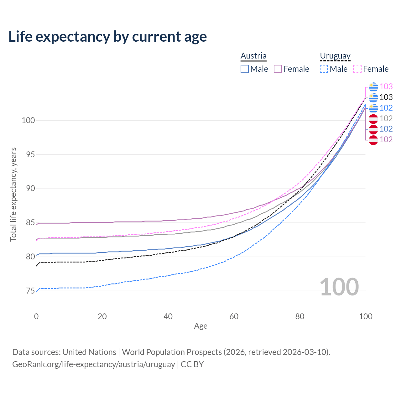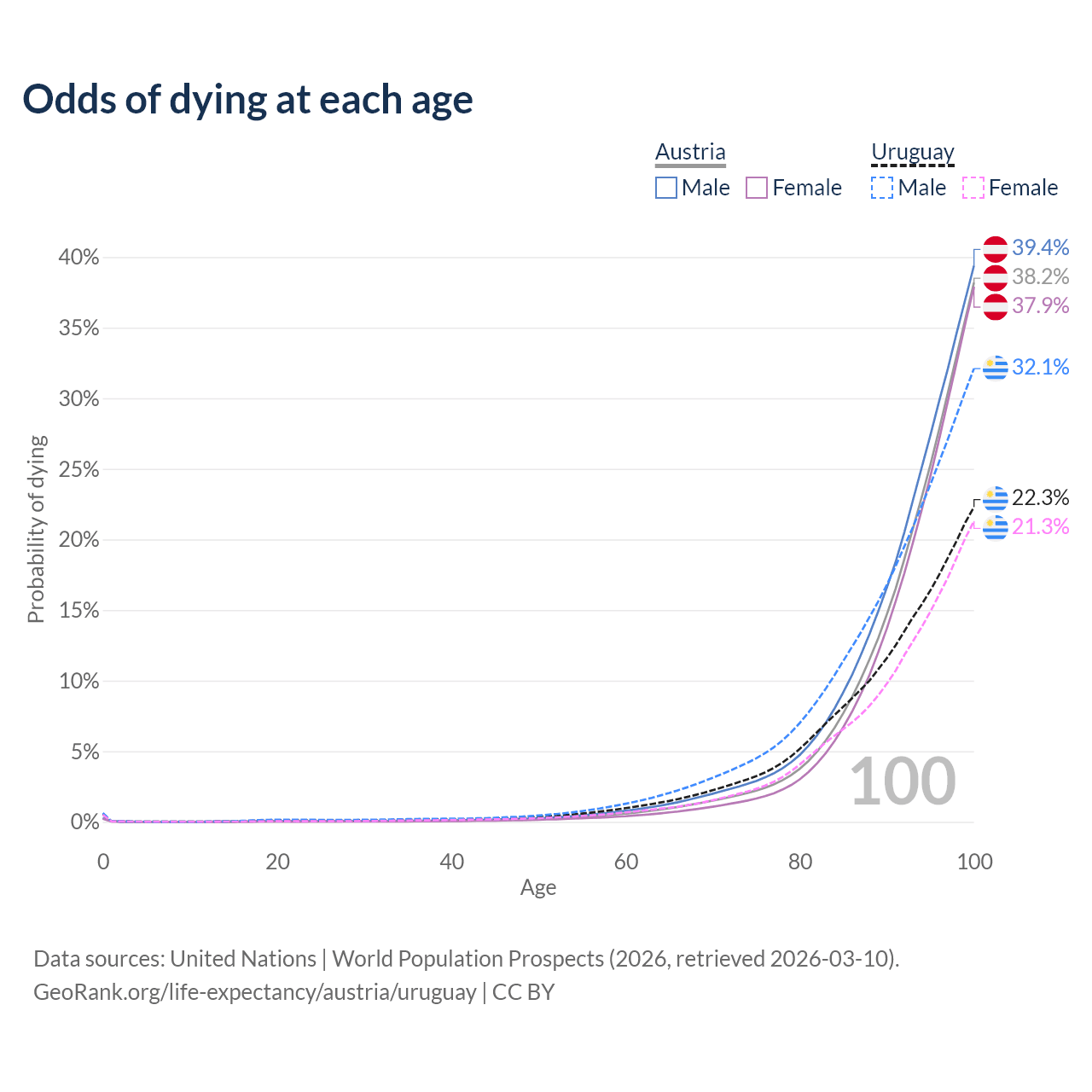 This life expectancy calculator shows the odds of living to 100, 95, 90, and below based on current age for both males and females in Austria and Uruguay, along with mean and median age of death. The calculations are based on the 2026 life tables (actuarial tables) from the UN World Population Prospects.