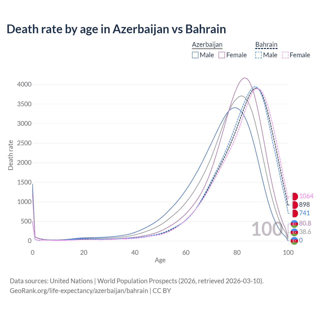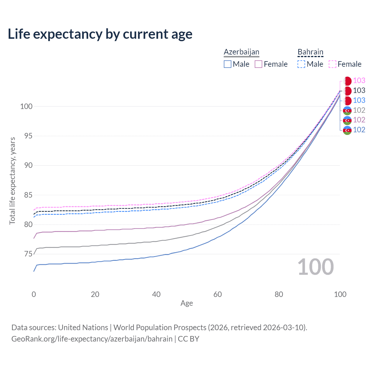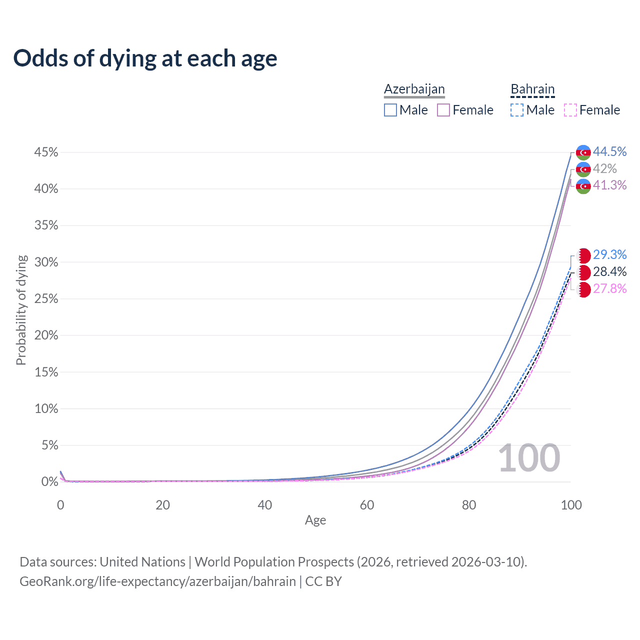 This life expectancy calculator shows the odds of living to 100, 95, 90, and below based on current age for both males and females in Azerbaijan and Bahrain, along with mean and median age of death. The calculations are based on the 2026 life tables (actuarial tables) from the UN World Population Prospects.