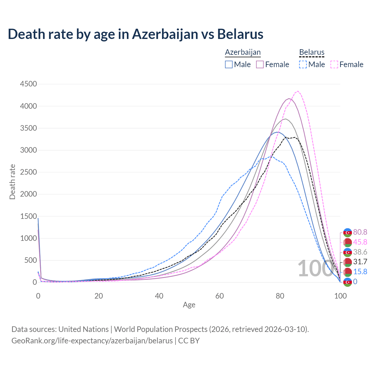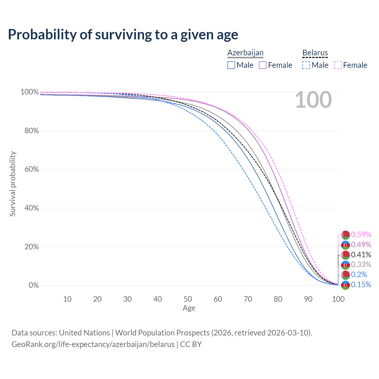 This life expectancy calculator shows the odds of living to 100, 95, 90, and below based on current age for both males and females in Azerbaijan and Belarus, along with mean and median age of death. The calculations are based on the 2026 life tables (actuarial tables) from the UN World Population Prospects.