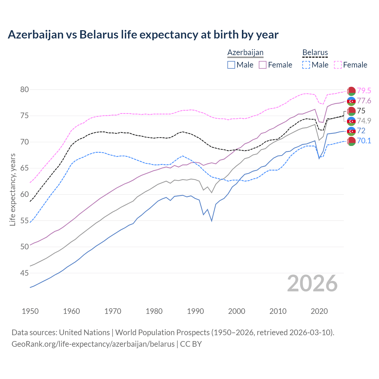 The average life expectancy at birth is 74.9 years in Azerbaijan vs 75 in Belarus. Azerbaijan is ranked 98/197 by life expectancy, and Belarus is 97/197. In Azerbaijan, the life expectancy is 72 years for males and 77.6 years for females. In Belarus, it's 70.1 years for males and 79.5 years for females.