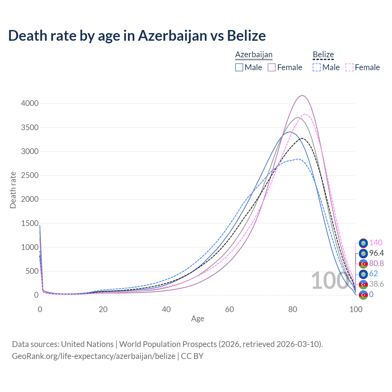 In Azerbaijan, the most common age of death is 82, compared to 83 in Belize. The median age of death is 78.3 in Azerbaijan and 77.5 in Belize, meaning only half of each cohort is expected to live past that age.