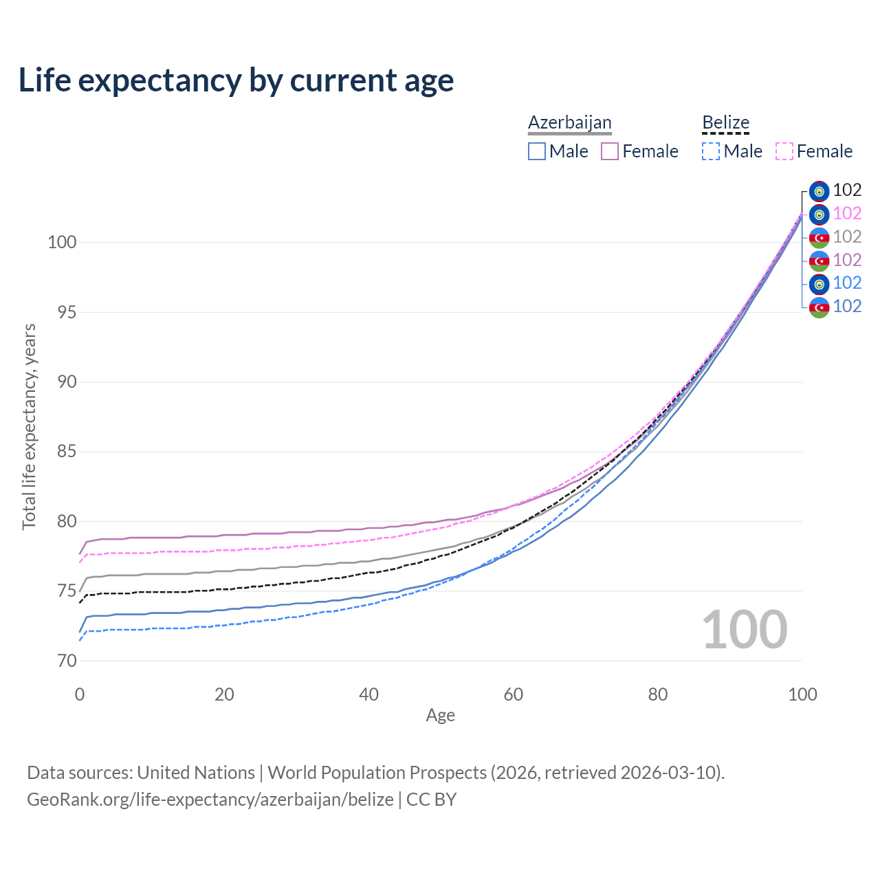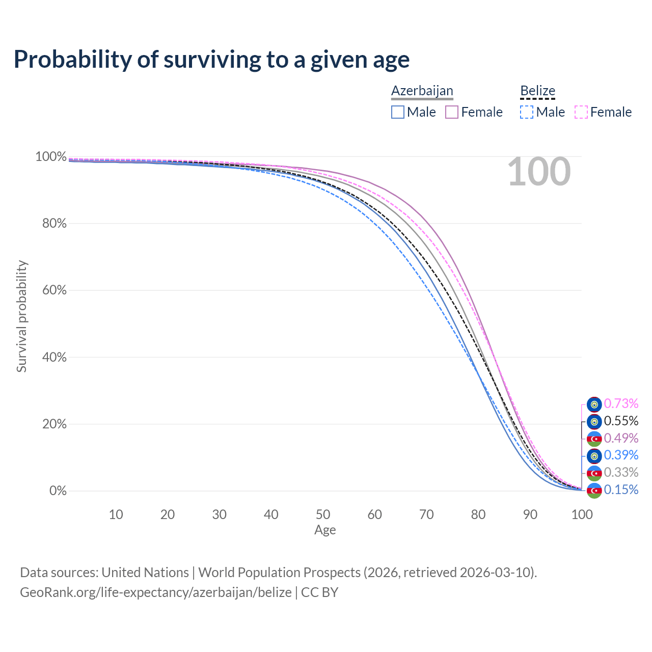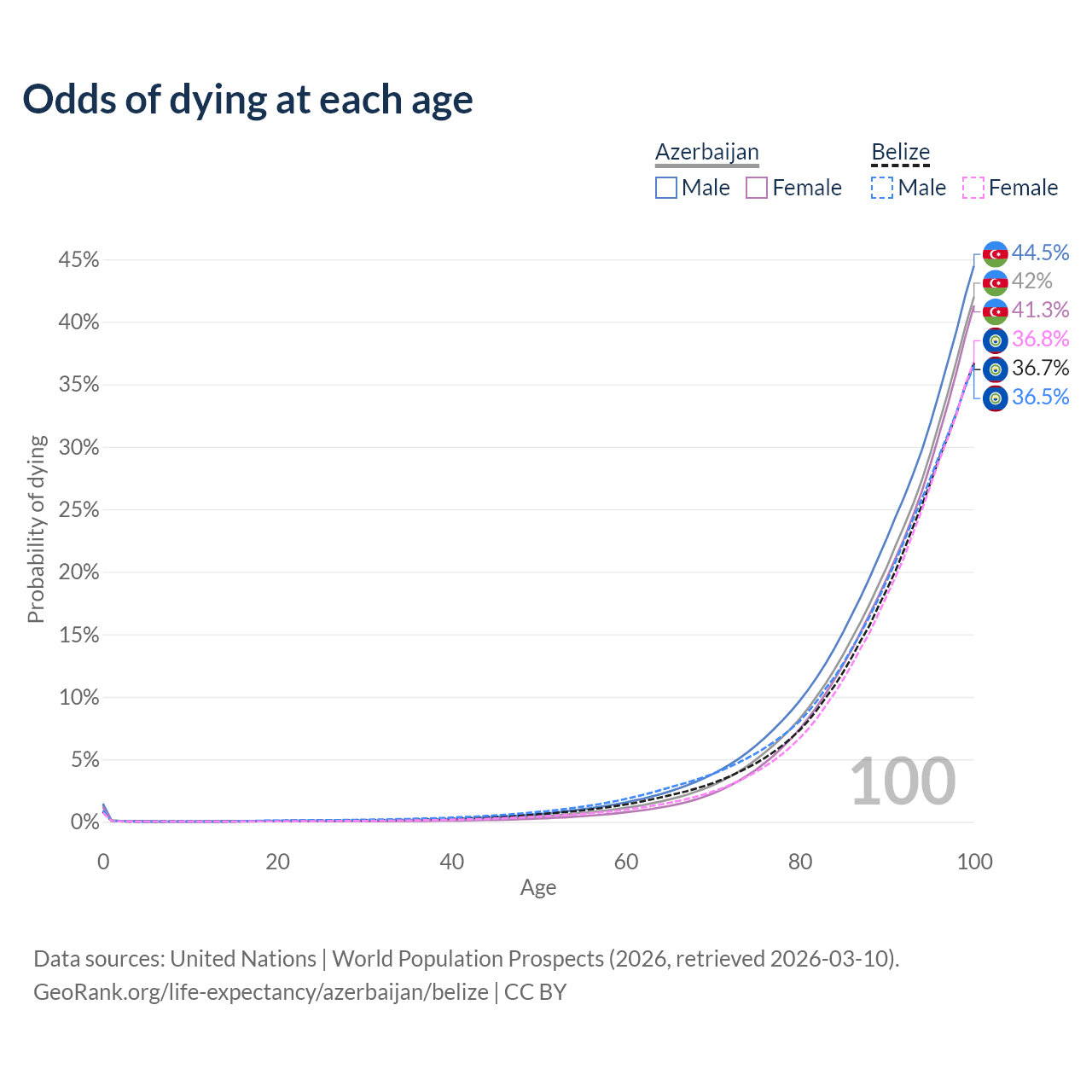 This life expectancy calculator shows the odds of living to 100, 95, 90, and below based on current age for both males and females in Azerbaijan and Belize, along with mean and median age of death. The calculations are based on the 2026 life tables (actuarial tables) from the UN World Population Prospects.