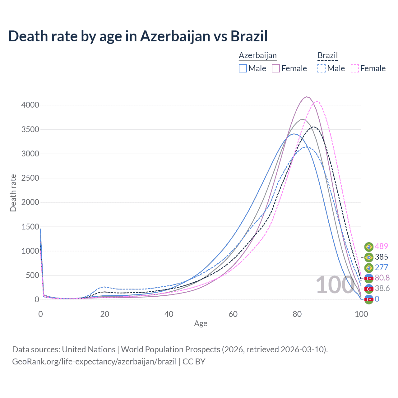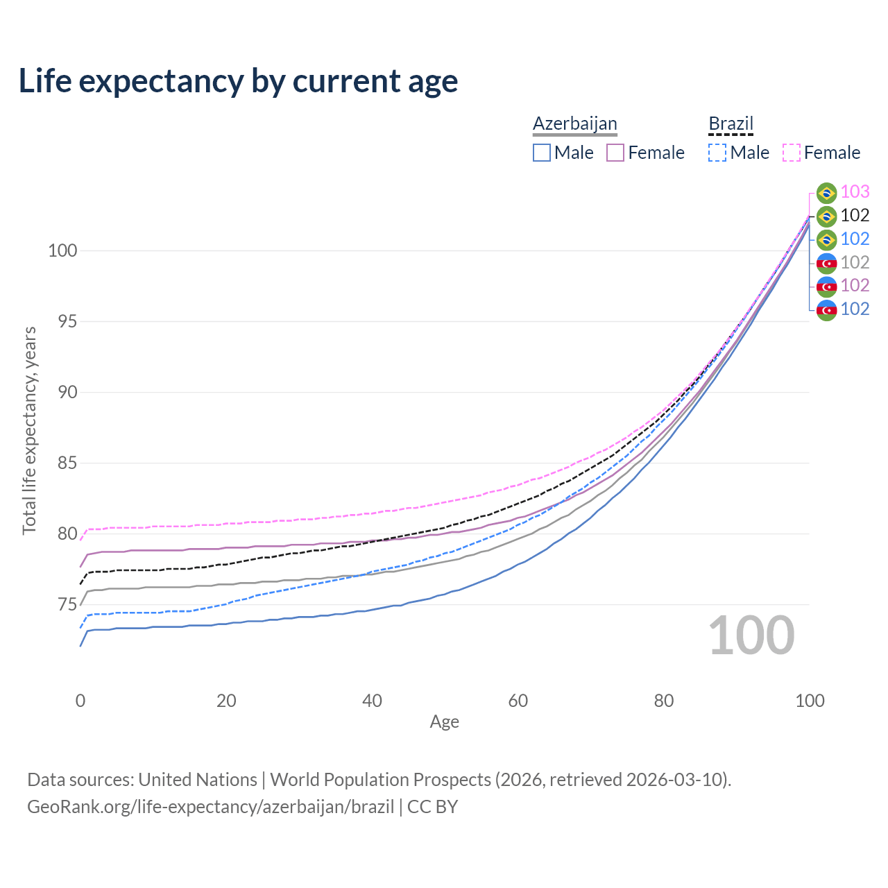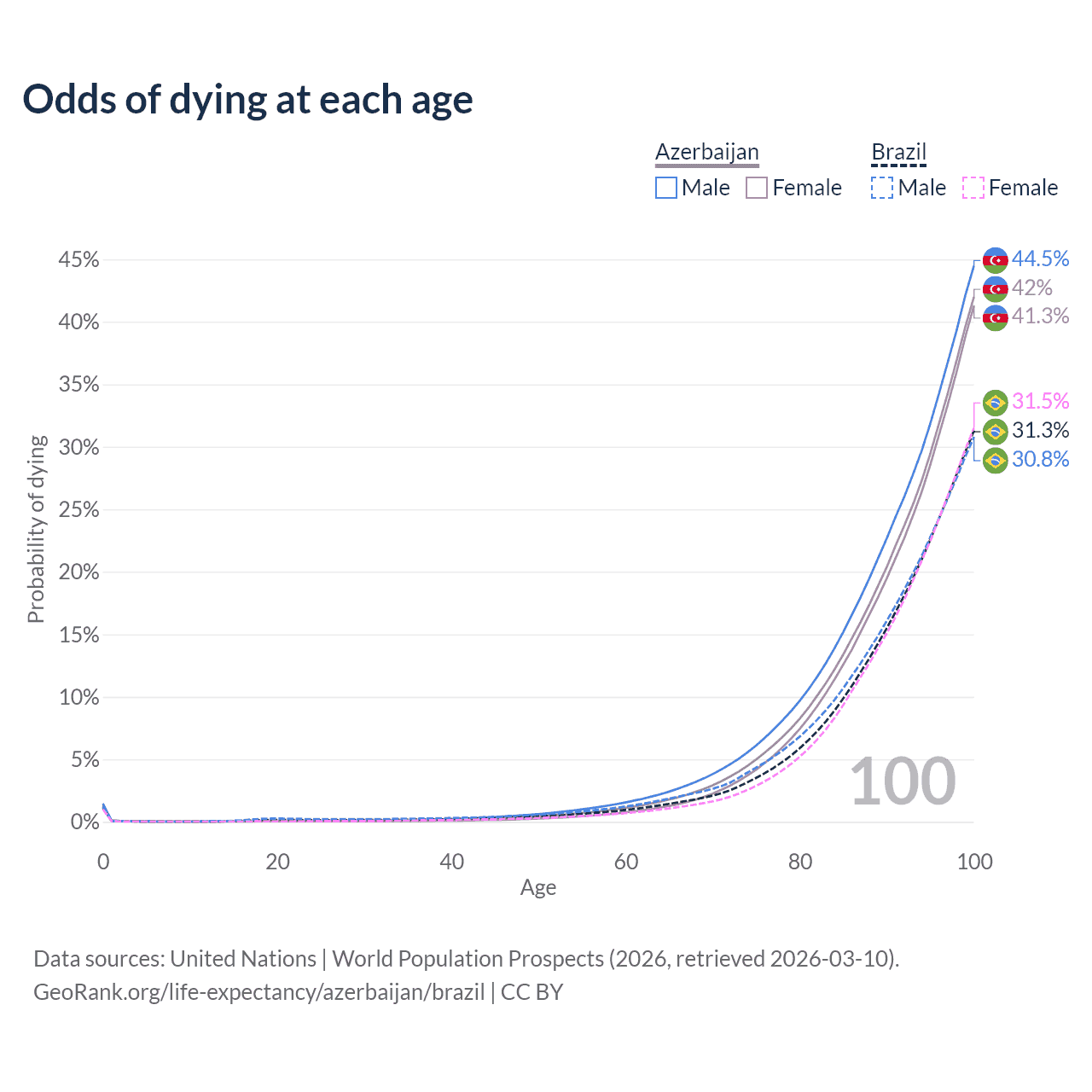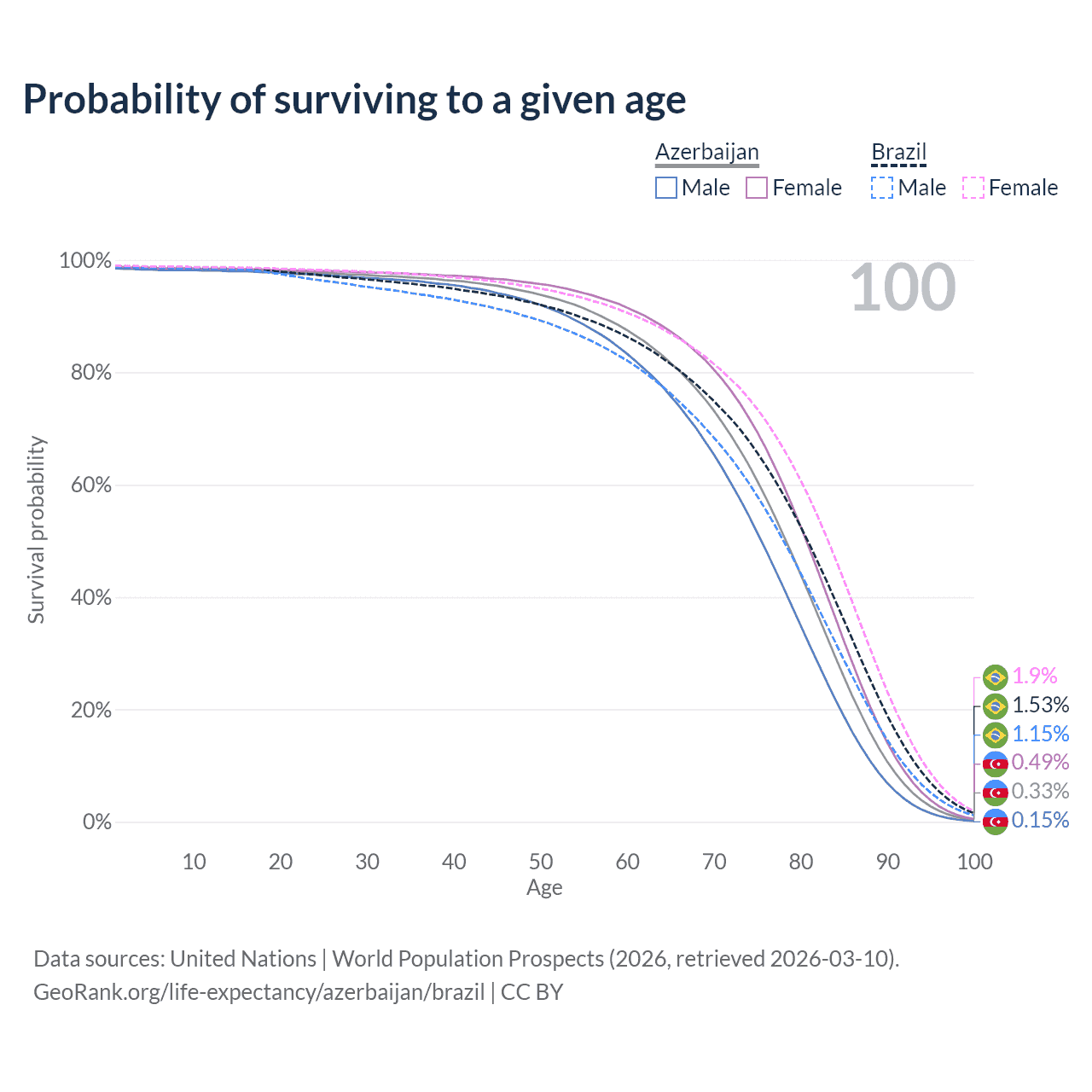 This life expectancy calculator shows the odds of living to 100, 95, 90, and below based on current age for both males and females in Azerbaijan and Brazil, along with mean and median age of death. The calculations are based on the 2026 life tables (actuarial tables) from the UN World Population Prospects.