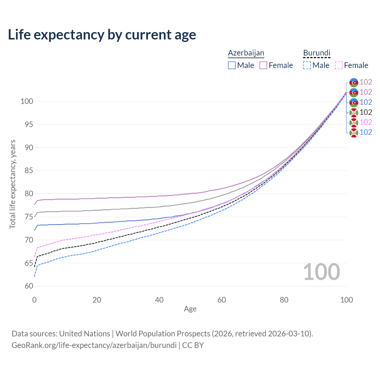 This life expectancy calculator shows the odds of living to 100, 95, 90, and below based on current age for both males and females in Azerbaijan and Burundi, along with mean and median age of death. The calculations are based on the 2026 life tables (actuarial tables) from the UN World Population Prospects.