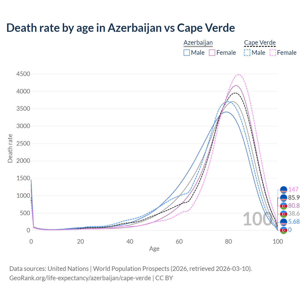 This life expectancy calculator shows the odds of living to 100, 95, 90, and below based on current age for both males and females in Azerbaijan and Cape Verde, along with mean and median age of death. The calculations are based on the 2026 life tables (actuarial tables) from the UN World Population Prospects.