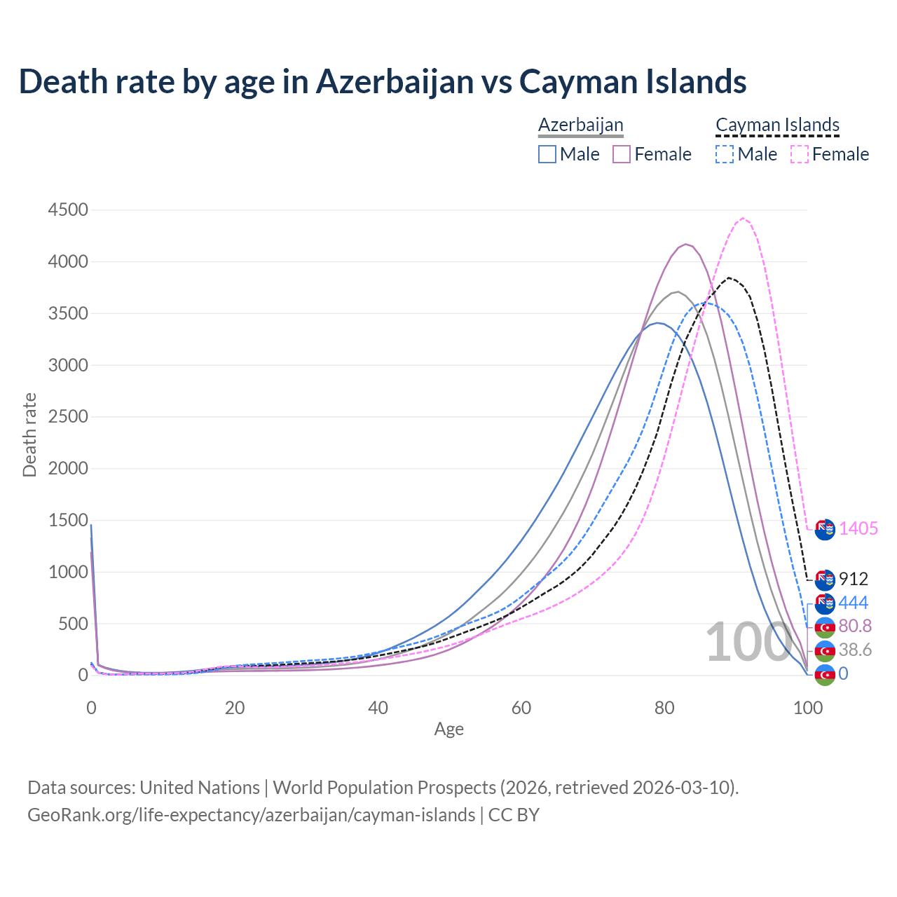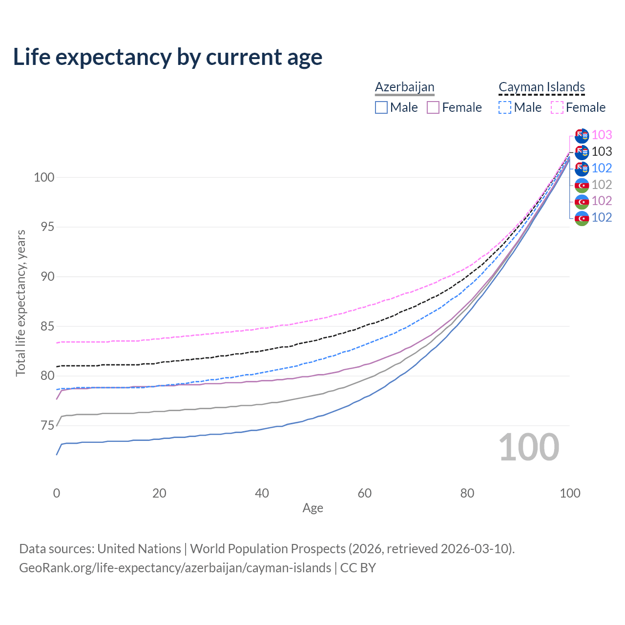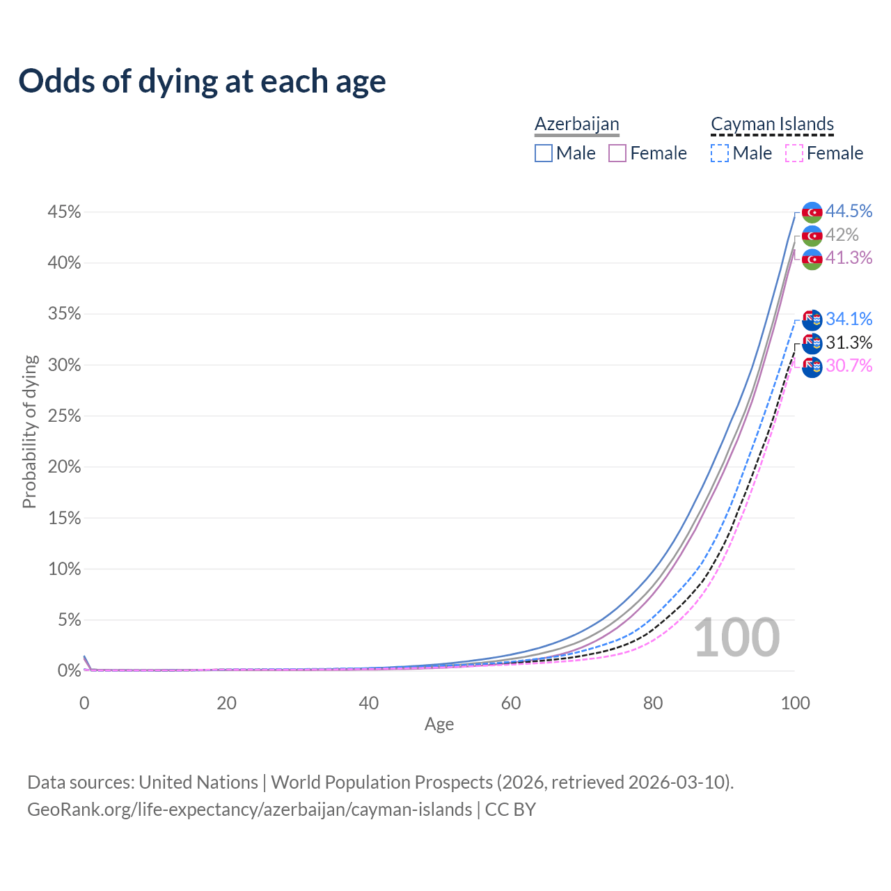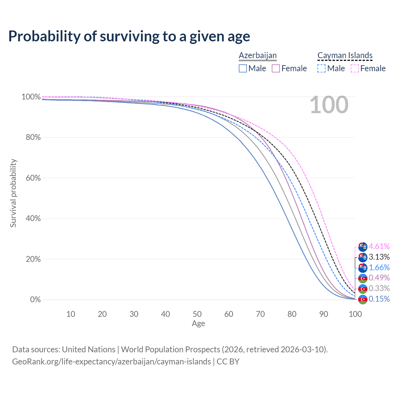 This life expectancy calculator shows the odds of living to 100, 95, 90, and below based on current age for both males and females in Azerbaijan and the Cayman Islands, along with mean and median age of death. The calculations are based on the 2026 life tables (actuarial tables) from the UN World Population Prospects.