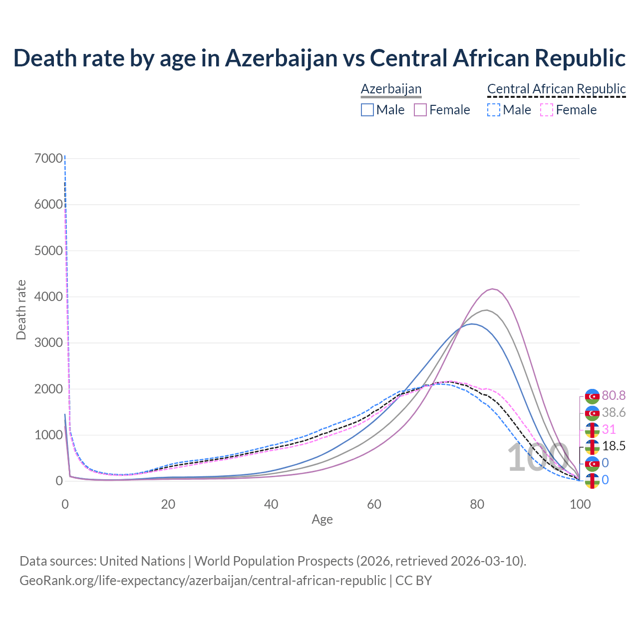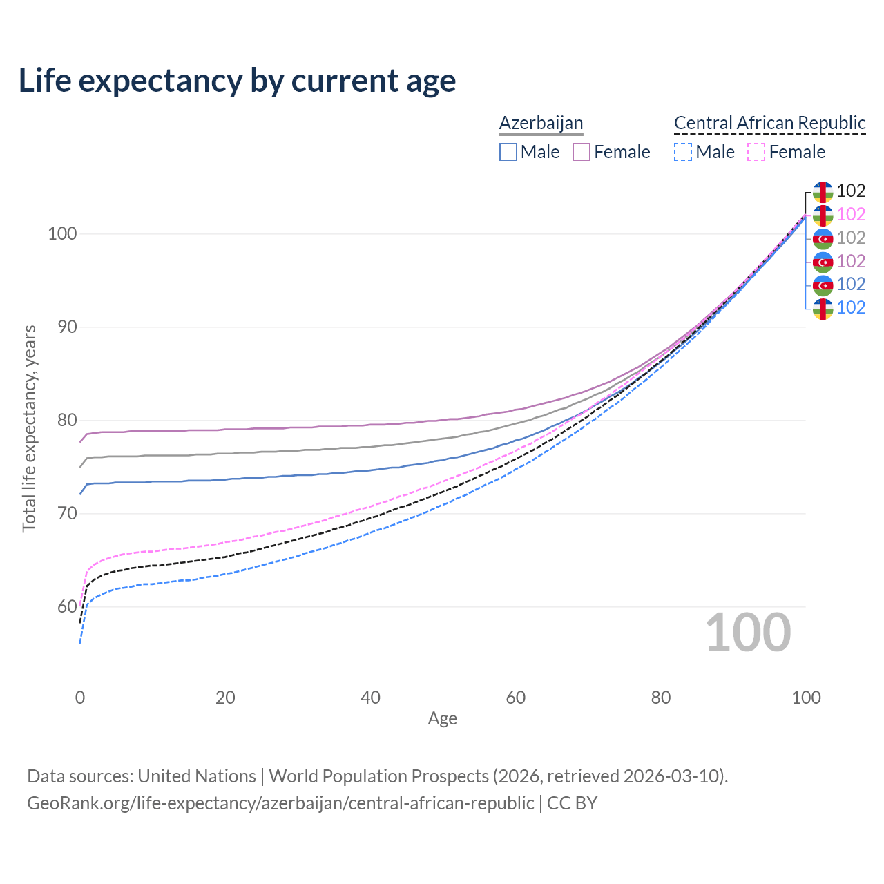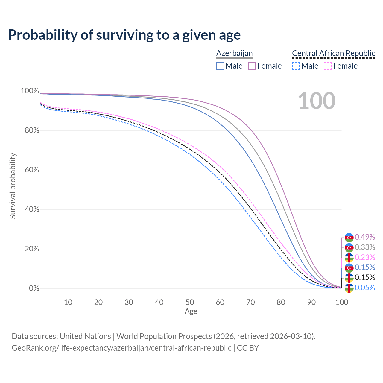 This life expectancy calculator shows the odds of living to 100, 95, 90, and below based on current age for both males and females in Azerbaijan and the Central African Republic, along with mean and median age of death. The calculations are based on the 2026 life tables (actuarial tables) from the UN World Population Prospects.
