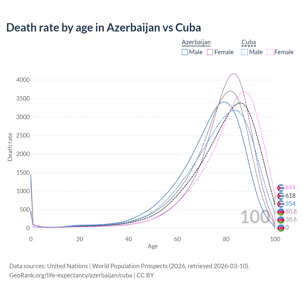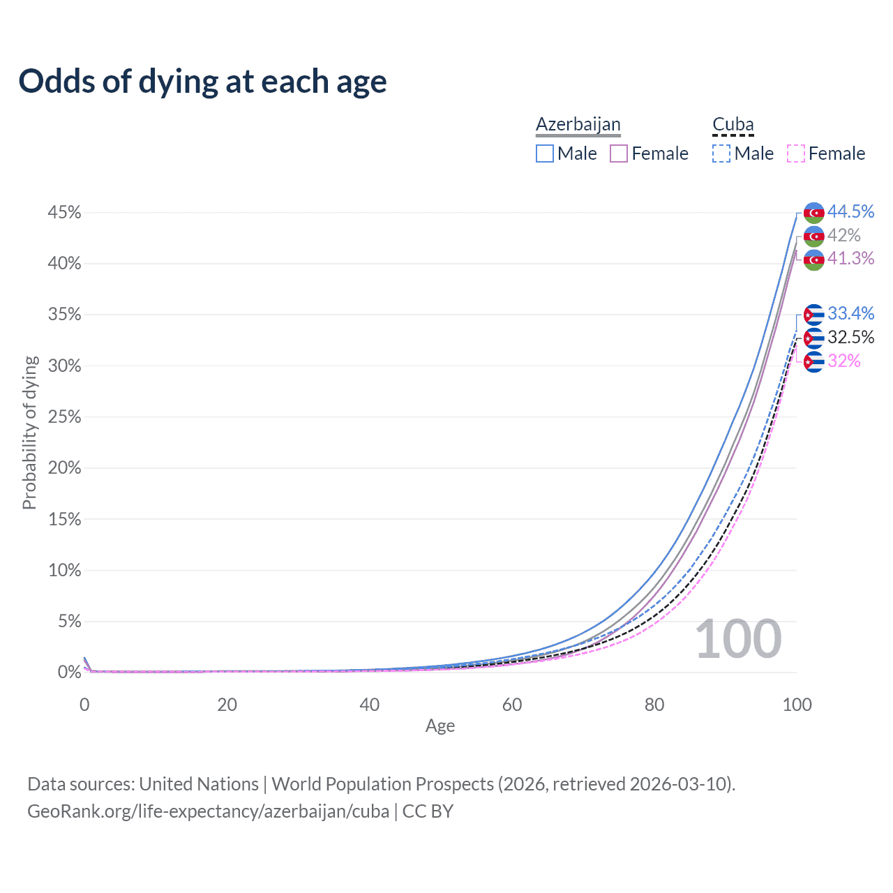 This life expectancy calculator shows the odds of living to 100, 95, 90, and below based on current age for both males and females in Azerbaijan and Cuba, along with mean and median age of death. The calculations are based on the 2026 life tables (actuarial tables) from the UN World Population Prospects.