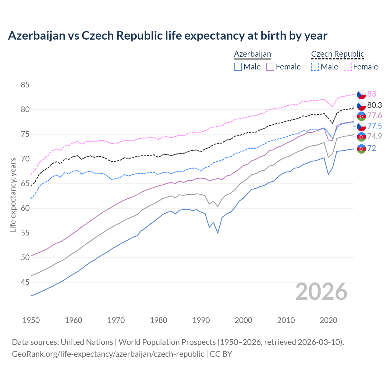 The average life expectancy at birth is 74.9 years in Azerbaijan vs 80.3 in the Czech Republic. Azerbaijan is ranked 98/197 by life expectancy, and the Czech Republic is 44/197. In Azerbaijan, the life expectancy is 72 years for males and 77.6 years for females. In the Czech Republic, it's 77.5 years for males and 83 years for females.