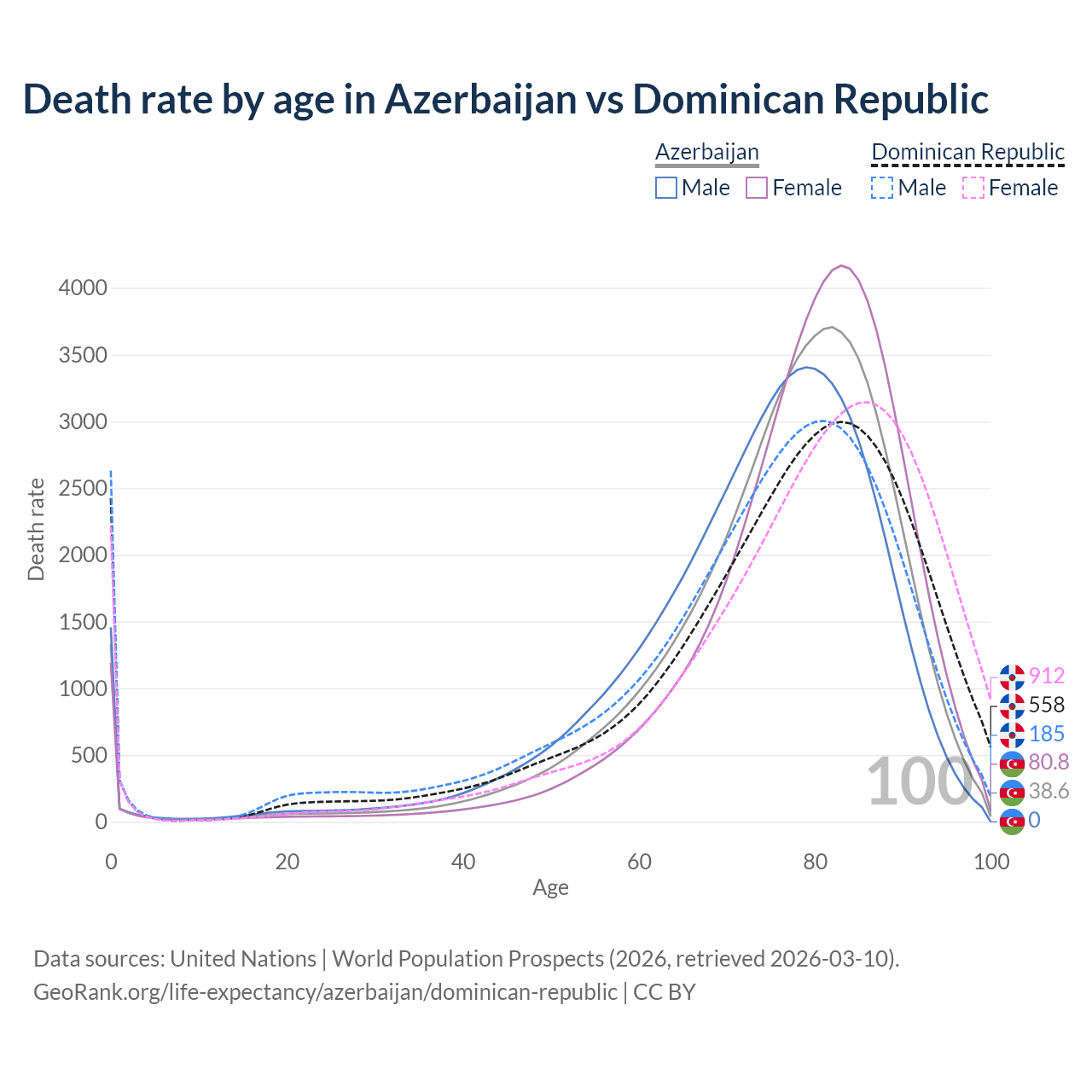 In Azerbaijan, the most common age of death is 82, compared to 83 in the Dominican Republic. The median age of death is 78.3 in Azerbaijan and 78.9 in the Dominican Republic, meaning only half of each cohort is expected to live past that age.