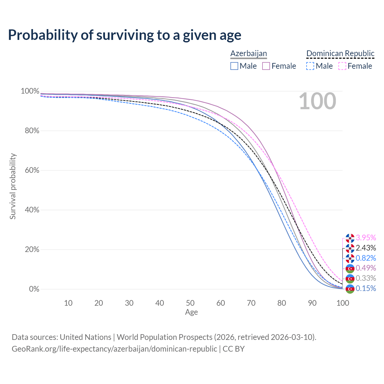 This life expectancy calculator shows the odds of living to 100, 95, 90, and below based on current age for both males and females in Azerbaijan and the Dominican Republic, along with mean and median age of death. The calculations are based on the 2026 life tables (actuarial tables) from the UN World Population Prospects.