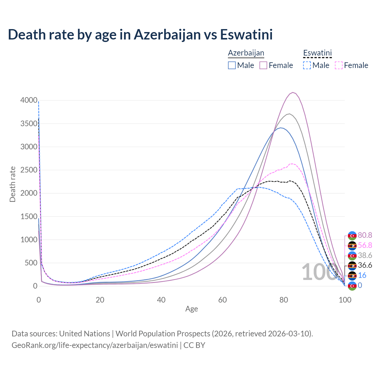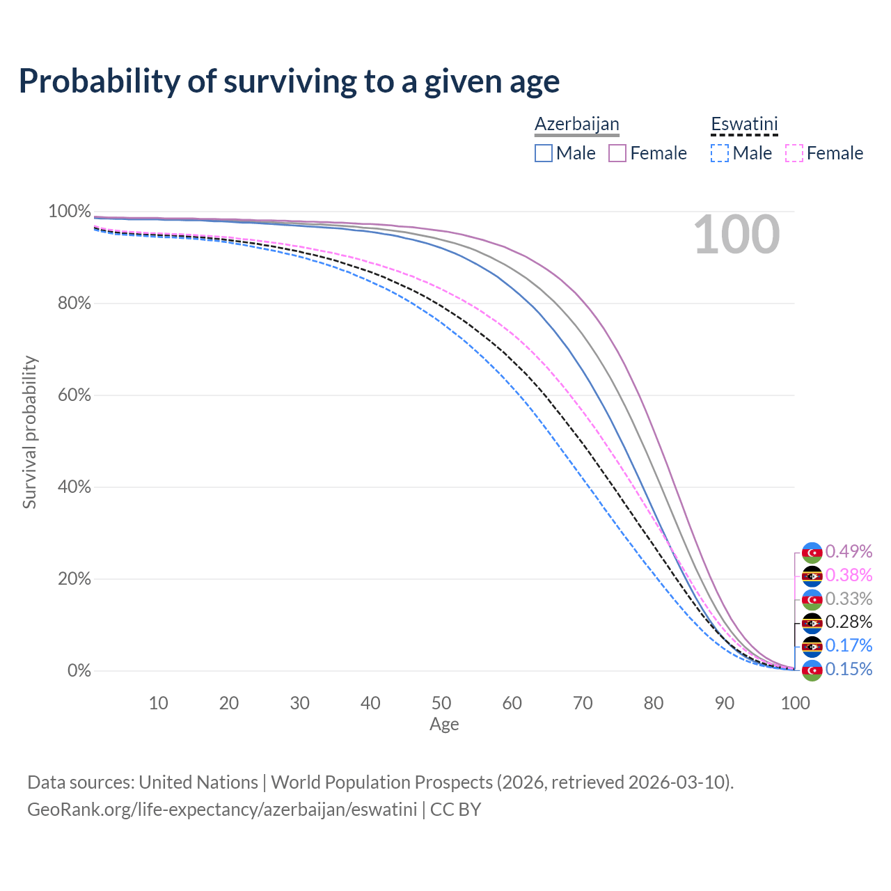 This life expectancy calculator shows the odds of living to 100, 95, 90, and below based on current age for both males and females in Azerbaijan and Eswatini, along with mean and median age of death. The calculations are based on the 2026 life tables (actuarial tables) from the UN World Population Prospects.