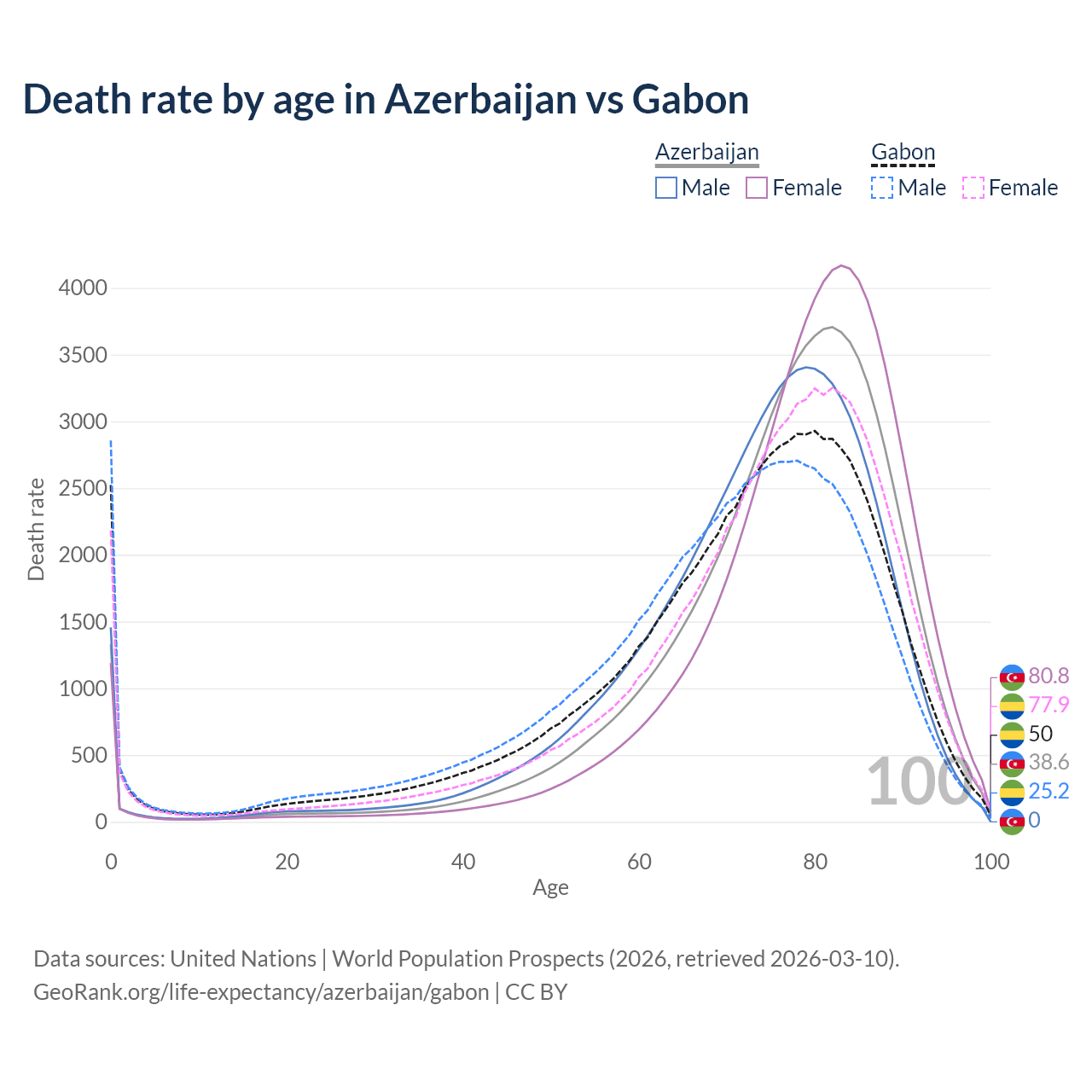 In Azerbaijan, the most common age of death is 82, compared to 80 in Gabon. The median age of death is 78.3 in Azerbaijan and 73.9 in Gabon, meaning only half of each cohort is expected to live past that age.