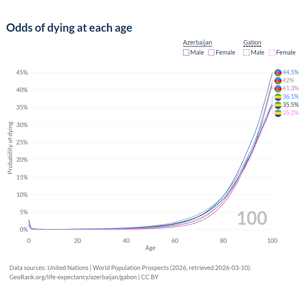 This life expectancy calculator shows the odds of living to 100, 95, 90, and below based on current age for both males and females in Azerbaijan and Gabon, along with mean and median age of death. The calculations are based on the 2026 life tables (actuarial tables) from the UN World Population Prospects.