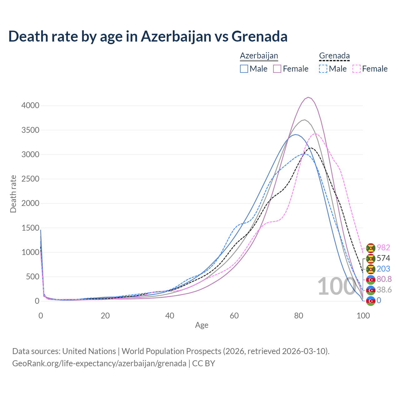 In Azerbaijan, the most common age of death is 82, compared to 84 in Grenada. The median age of death is 78.3 in Azerbaijan and 79.3 in Grenada, meaning only half of each cohort is expected to live past that age.