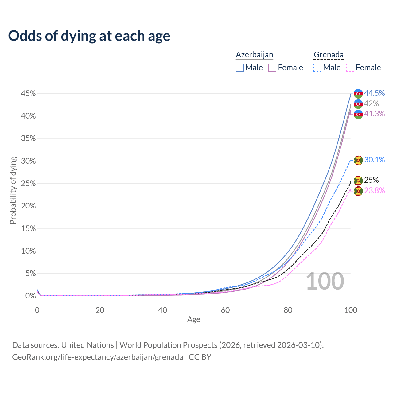 This life expectancy calculator shows the odds of living to 100, 95, 90, and below based on current age for both males and females in Azerbaijan and Grenada, along with mean and median age of death. The calculations are based on the 2026 life tables (actuarial tables) from the UN World Population Prospects.