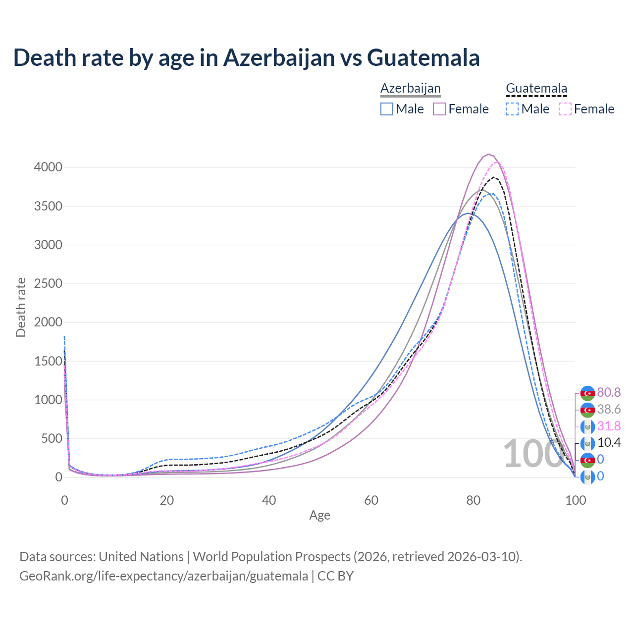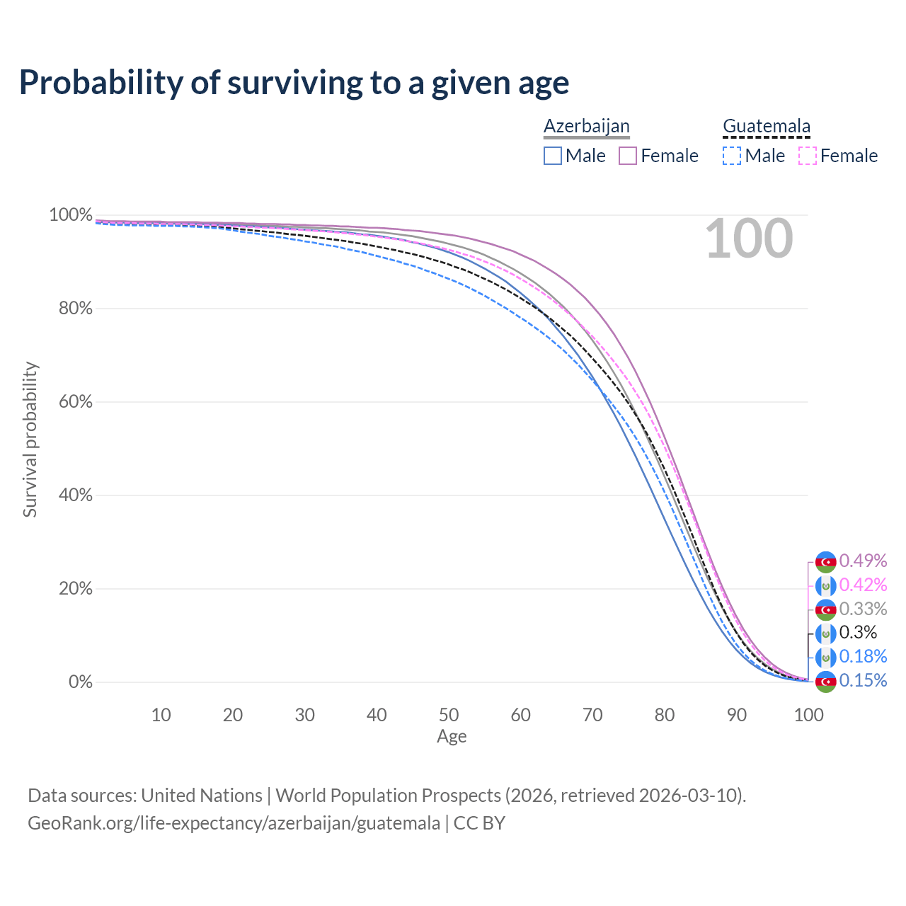 This life expectancy calculator shows the odds of living to 100, 95, 90, and below based on current age for both males and females in Azerbaijan and Guatemala, along with mean and median age of death. The calculations are based on the 2026 life tables (actuarial tables) from the UN World Population Prospects.