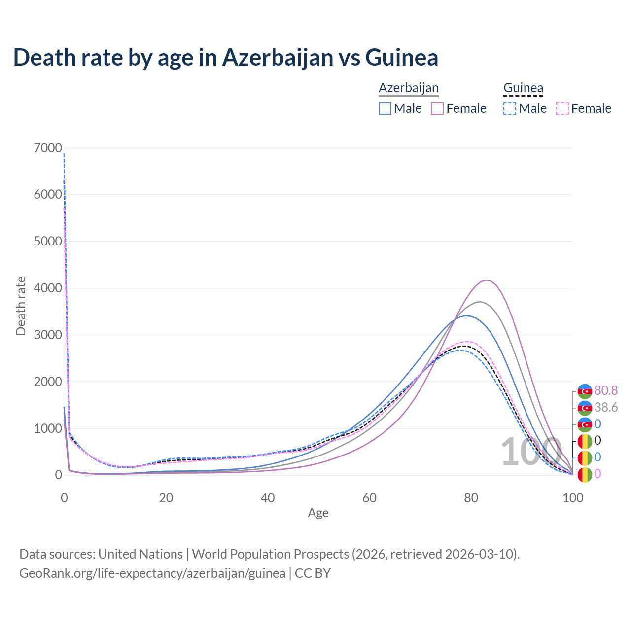 In Azerbaijan, the most common age of death is 82, compared to 0 in Guinea. The median age of death is 78.3 in Azerbaijan and 70.6 in Guinea, meaning only half of each cohort is expected to live past that age.