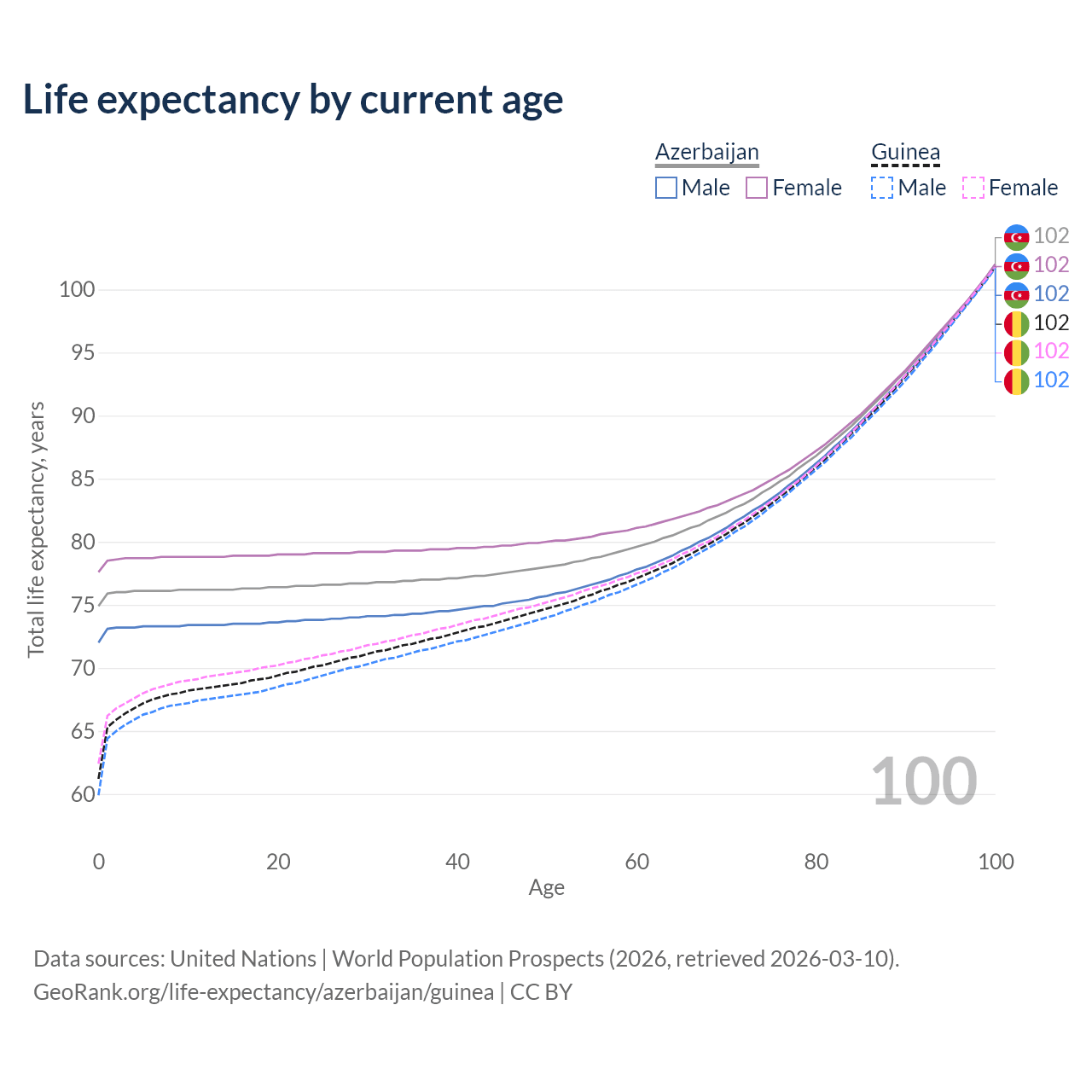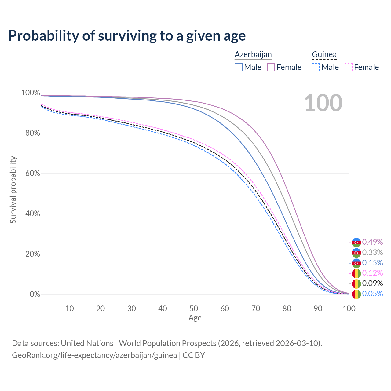 This life expectancy calculator shows the odds of living to 100, 95, 90, and below based on current age for both males and females in Azerbaijan and Guinea, along with mean and median age of death. The calculations are based on the 2026 life tables (actuarial tables) from the UN World Population Prospects.