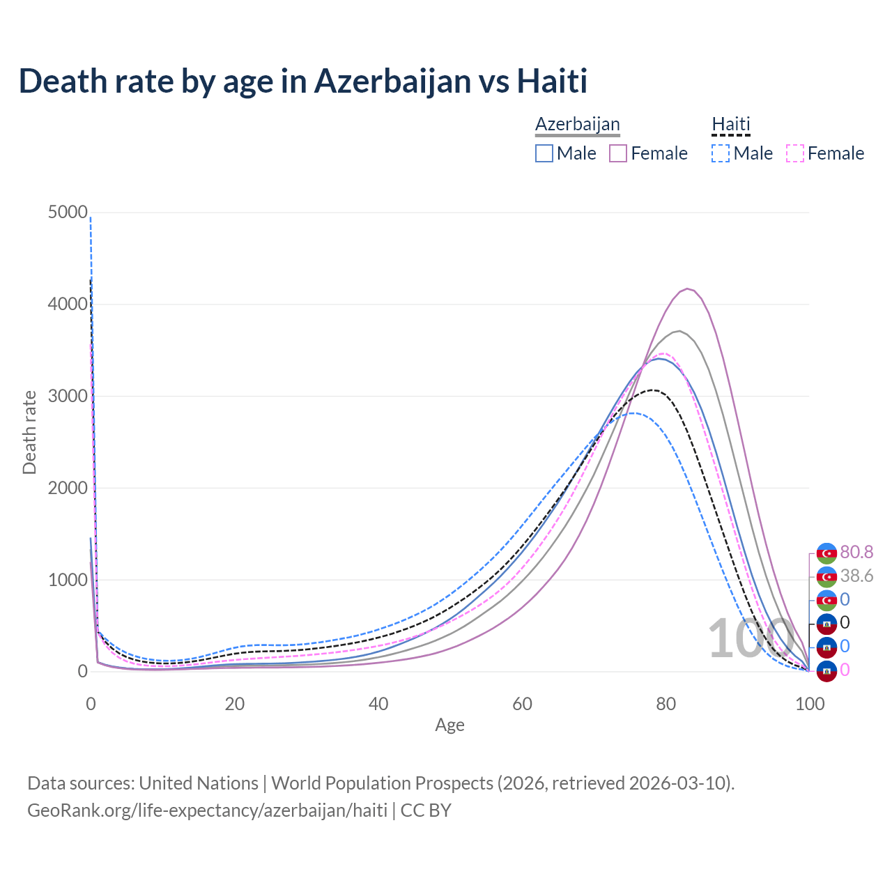 This life expectancy calculator shows the odds of living to 100, 95, 90, and below based on current age for both males and females in Azerbaijan and Haiti, along with mean and median age of death. The calculations are based on the 2026 life tables (actuarial tables) from the UN World Population Prospects.
