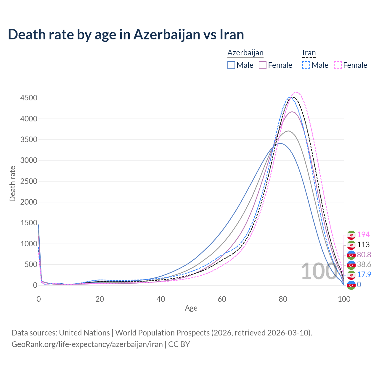 This life expectancy calculator shows the odds of living to 100, 95, 90, and below based on current age for both males and females in Azerbaijan and Iran, along with mean and median age of death. The calculations are based on the 2026 life tables (actuarial tables) from the UN World Population Prospects.