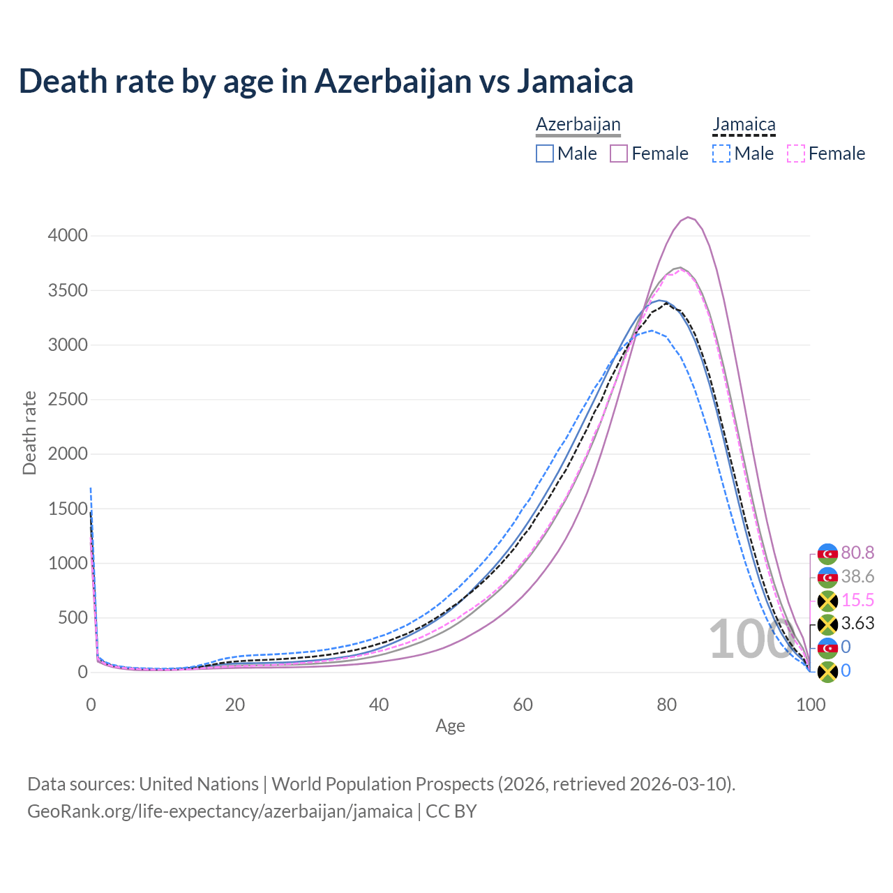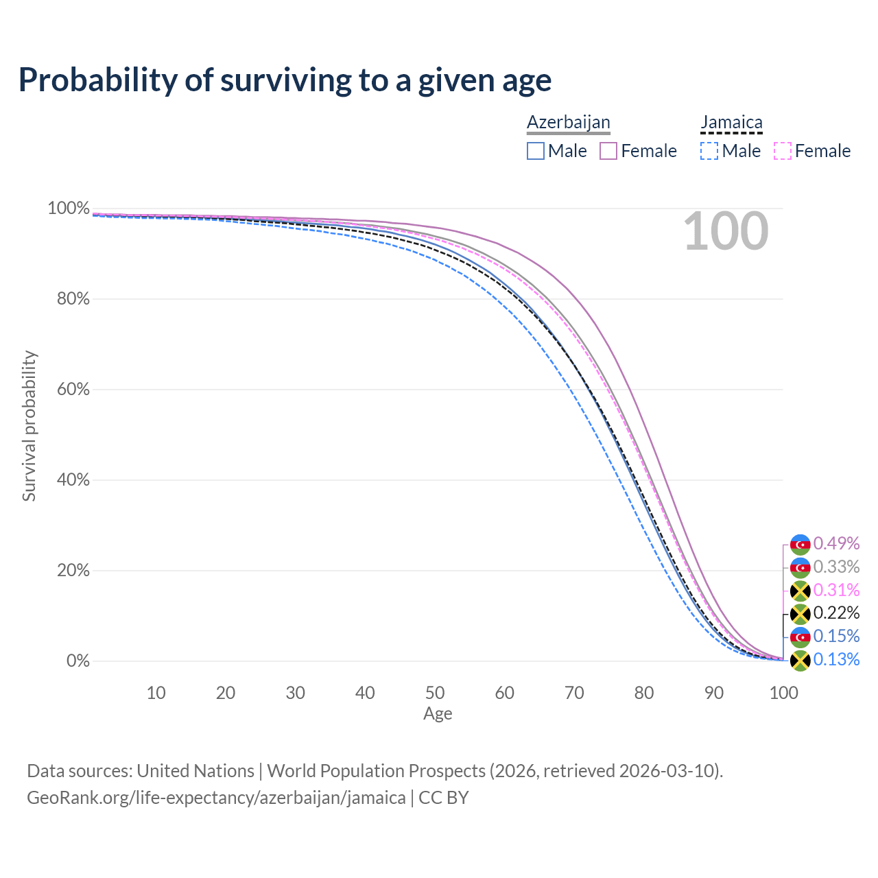 This life expectancy calculator shows the odds of living to 100, 95, 90, and below based on current age for both males and females in Azerbaijan and Jamaica, along with mean and median age of death. The calculations are based on the 2026 life tables (actuarial tables) from the UN World Population Prospects.