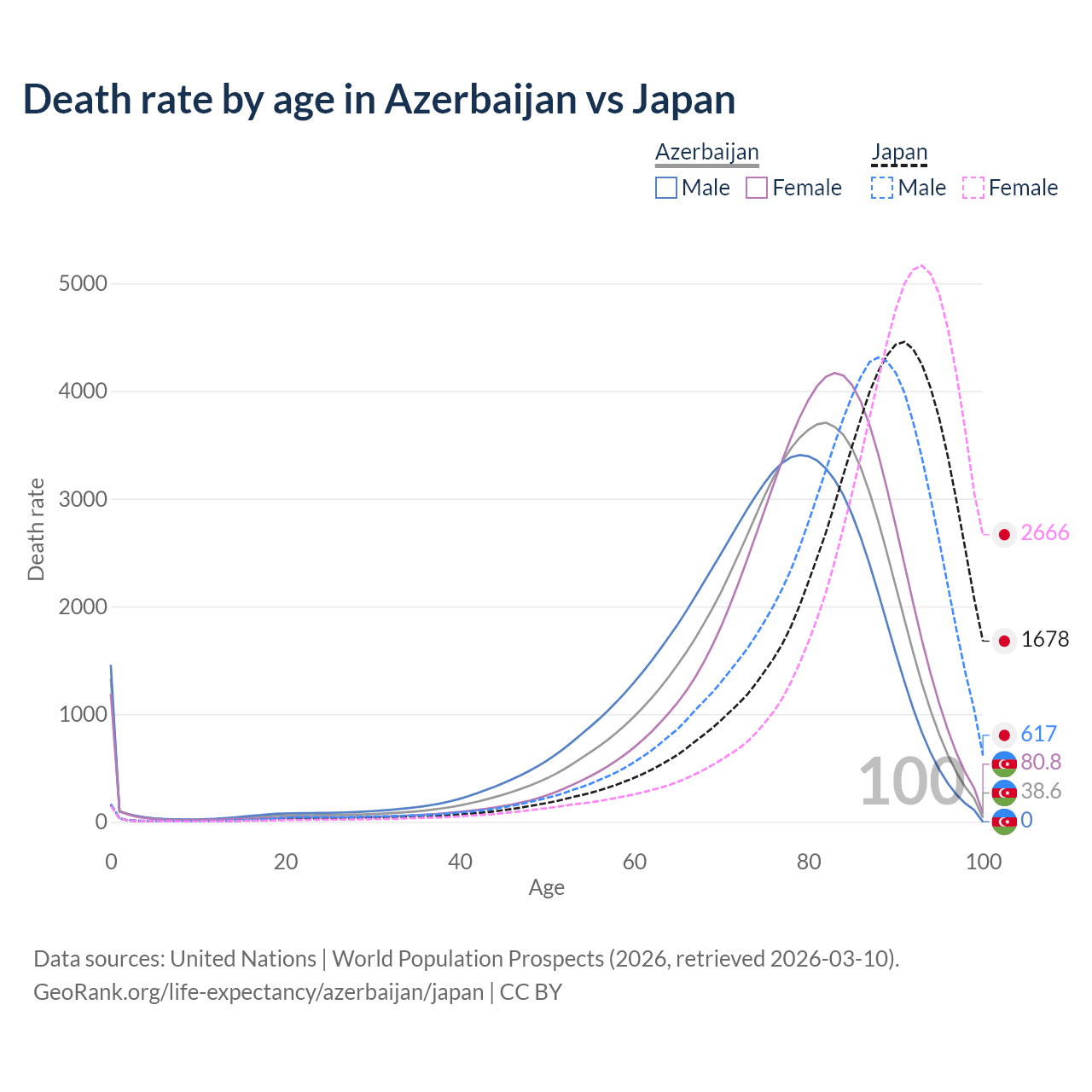 In Azerbaijan, the most common age of death is 82, compared to 91 in Japan. The median age of death is 78.3 in Azerbaijan and 88.1 in Japan, meaning only half of each cohort is expected to live past that age.