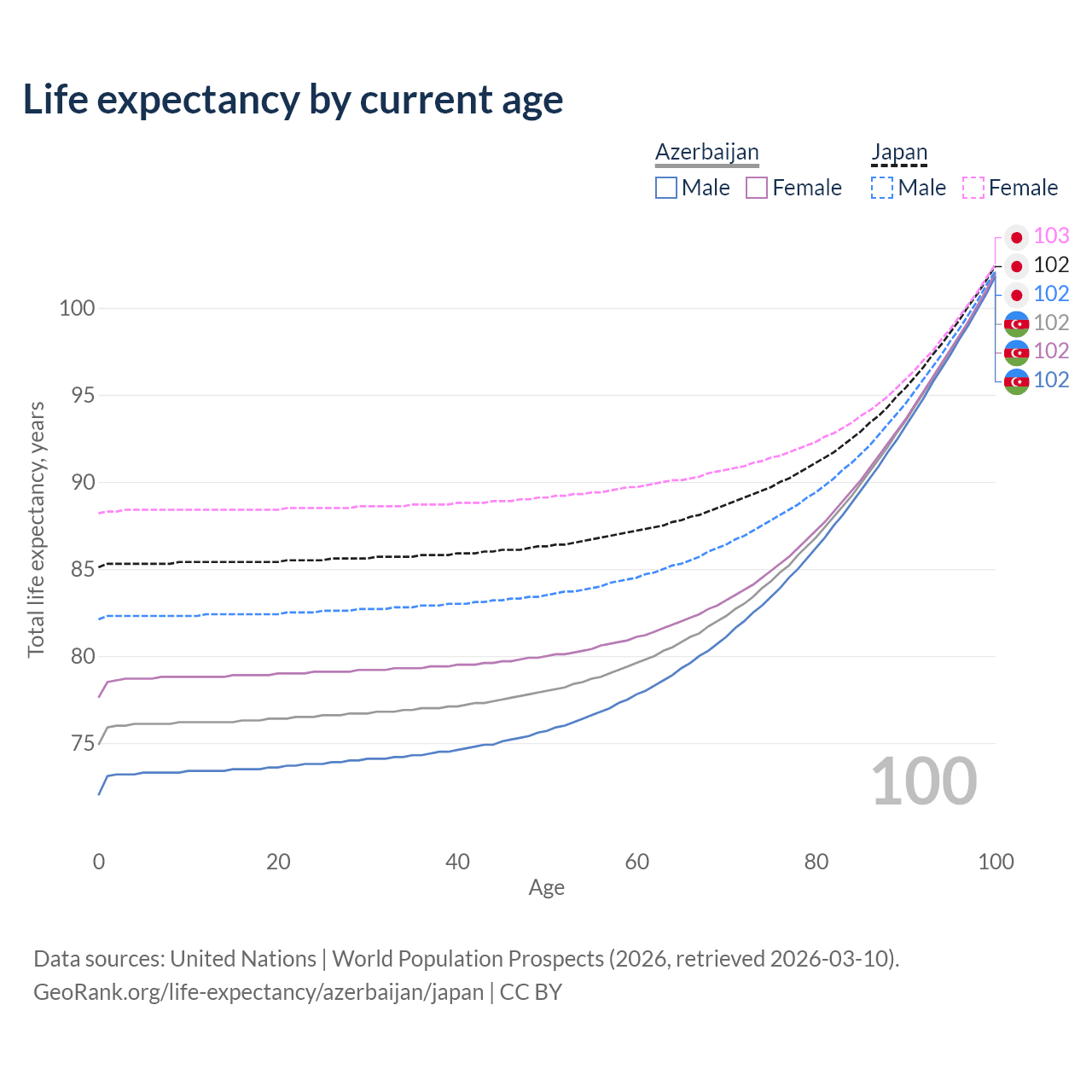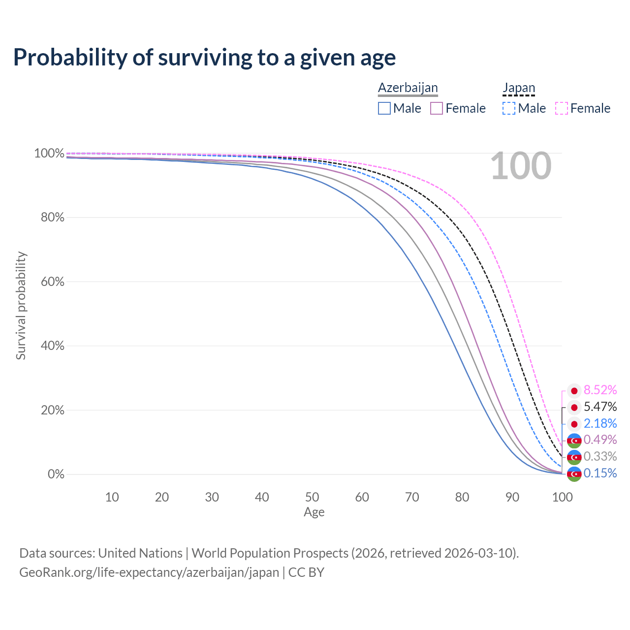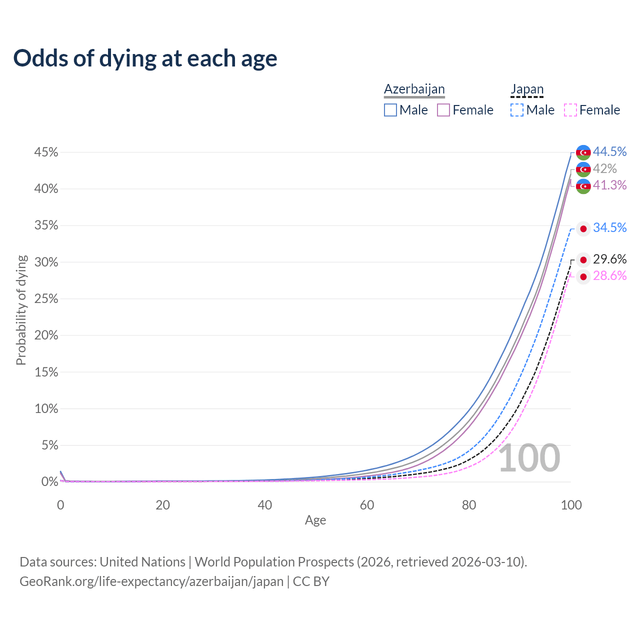 This life expectancy calculator shows the odds of living to 100, 95, 90, and below based on current age for both males and females in Azerbaijan and Japan, along with mean and median age of death. The calculations are based on the 2026 life tables (actuarial tables) from the UN World Population Prospects.
