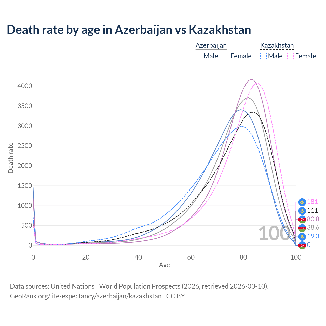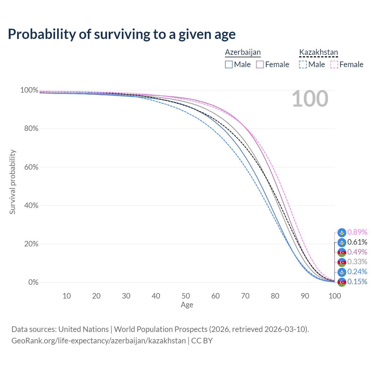 This life expectancy calculator shows the odds of living to 100, 95, 90, and below based on current age for both males and females in Azerbaijan and Kazakhstan, along with mean and median age of death. The calculations are based on the 2026 life tables (actuarial tables) from the UN World Population Prospects.