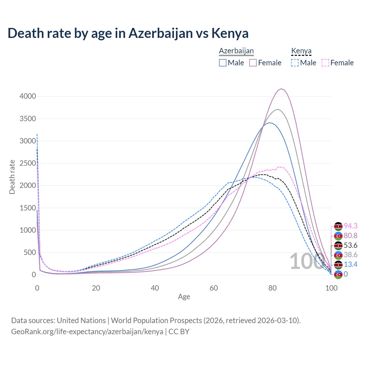 Note that this chart does not show rates per 100,000 population, as those would be skewed by age structure differences and reflect the demographics of Azerbaijan and Kenya more than their death rates.