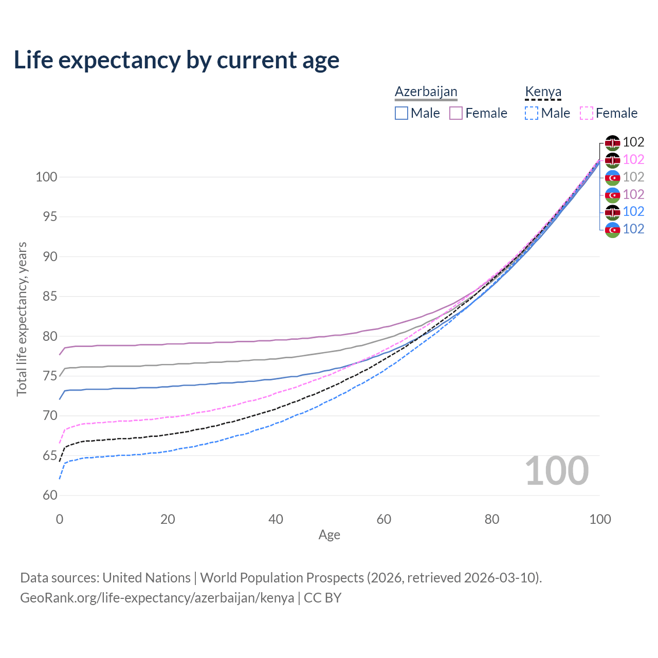 This life expectancy calculator shows the odds of living to 100, 95, 90, and below based on current age for both males and females in Azerbaijan and Kenya, along with mean and median age of death. The calculations are based on the 2026 life tables (actuarial tables) from the UN World Population Prospects.