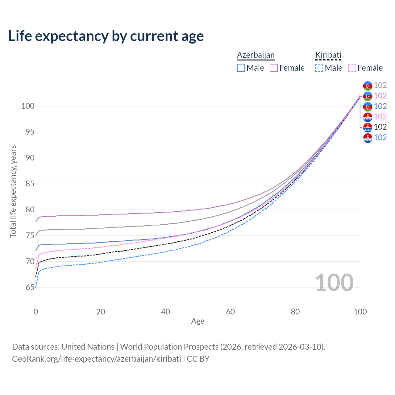 This life expectancy calculator shows the odds of living to 100, 95, 90, and below based on current age for both males and females in Azerbaijan and Kiribati, along with mean and median age of death. The calculations are based on the 2026 life tables (actuarial tables) from the UN World Population Prospects.