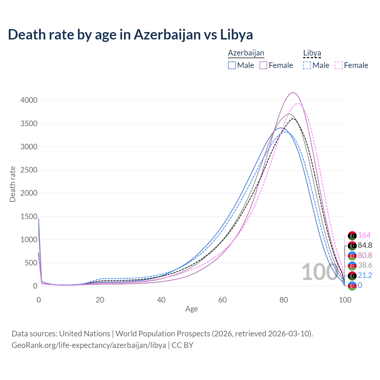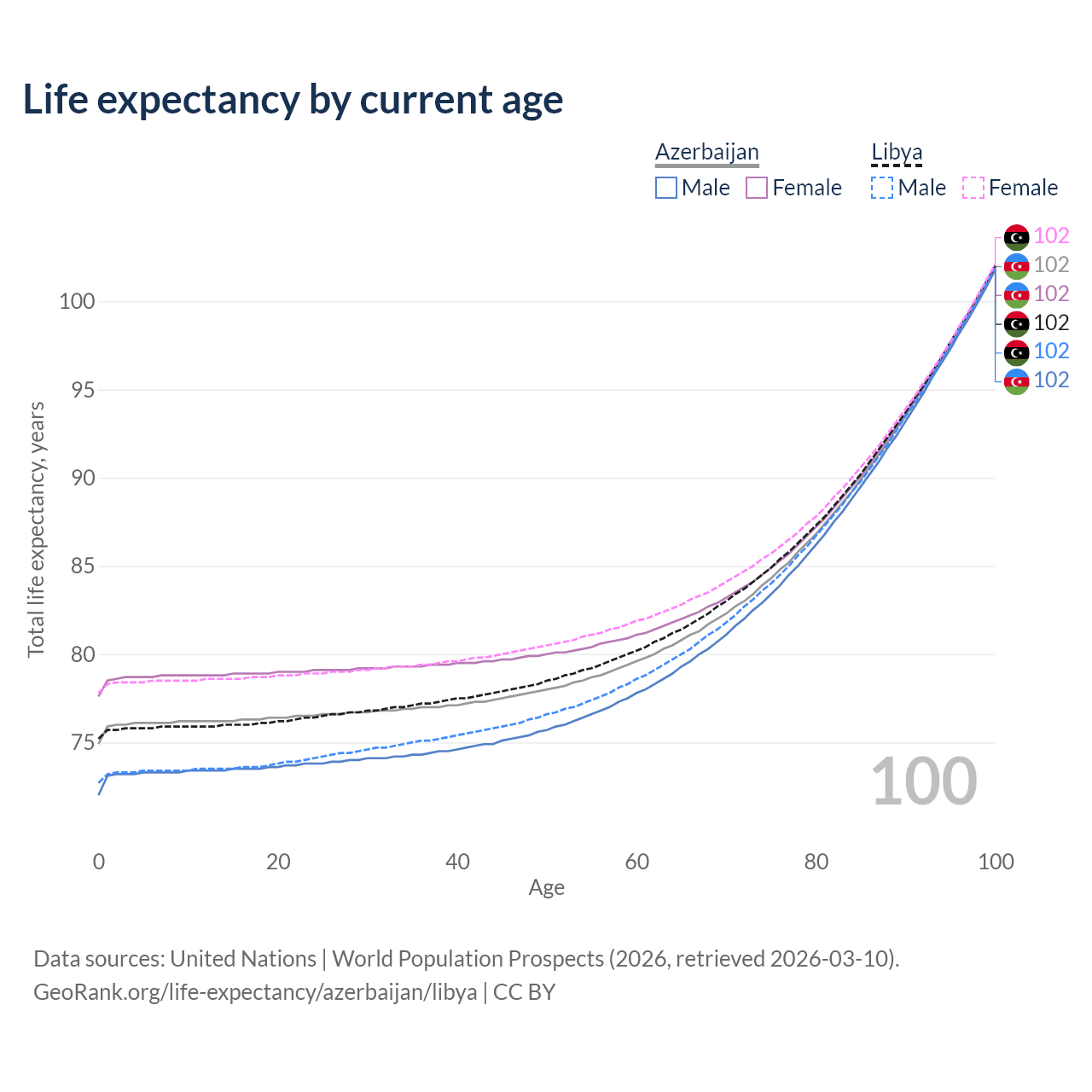 This life expectancy calculator shows the odds of living to 100, 95, 90, and below based on current age for both males and females in Azerbaijan and Libya, along with mean and median age of death. The calculations are based on the 2026 life tables (actuarial tables) from the UN World Population Prospects.