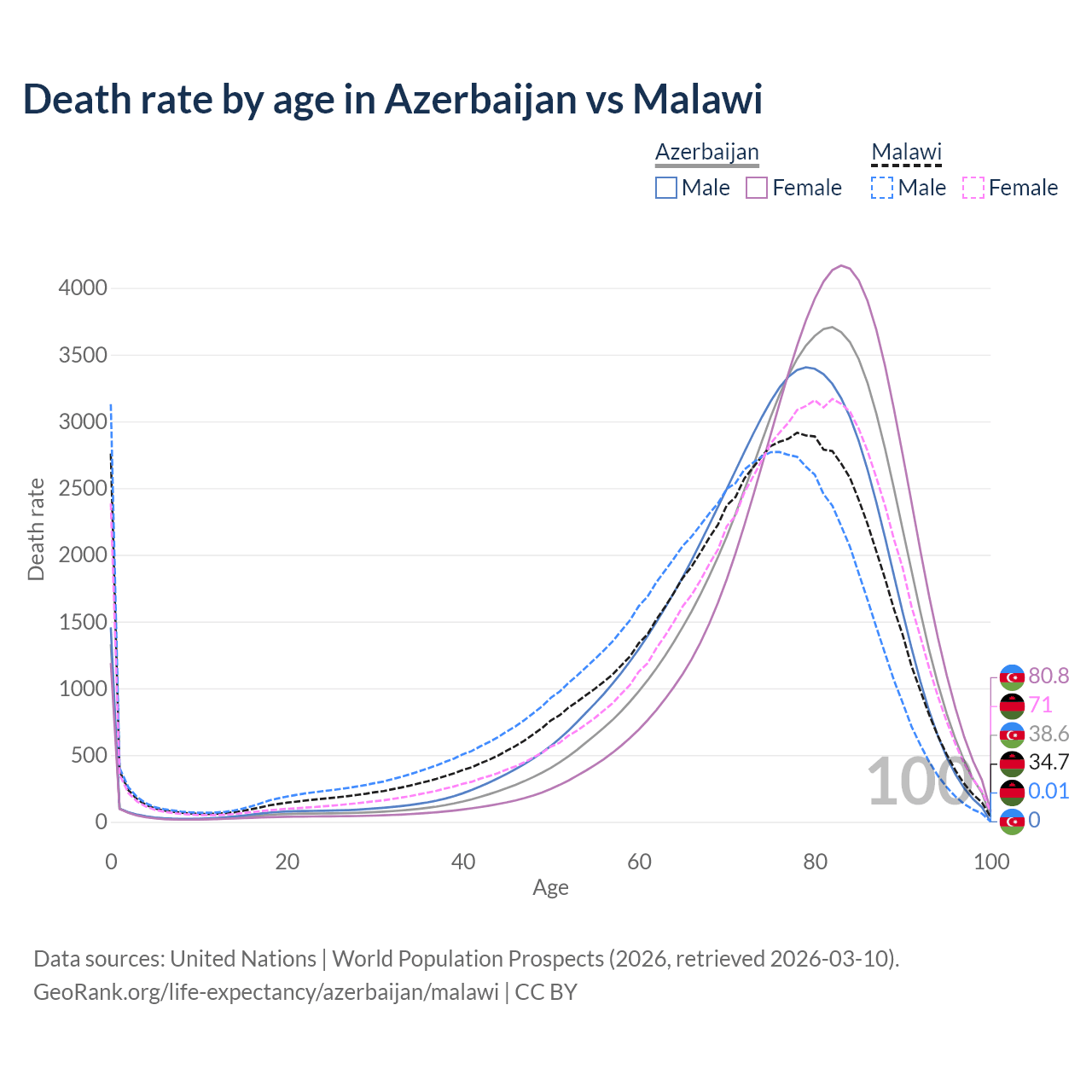 In Azerbaijan, the most common age of death is 82, compared to 78 in Malawi. The median age of death is 78.3 in Azerbaijan and 73.1 in Malawi, meaning only half of each cohort is expected to live past that age.