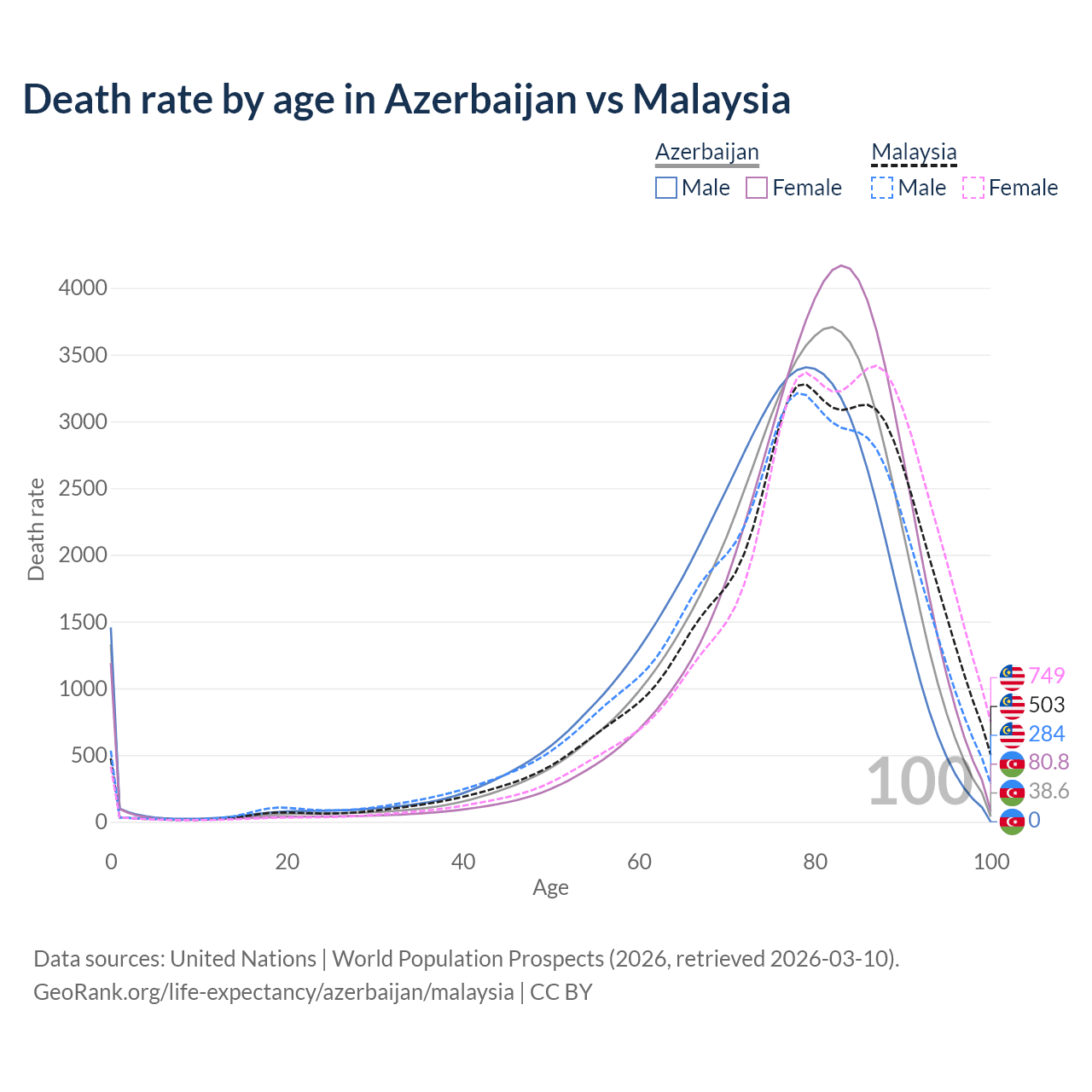 This life expectancy calculator shows the odds of living to 100, 95, 90, and below based on current age for both males and females in Azerbaijan and Malaysia, along with mean and median age of death. The calculations are based on the 2026 life tables (actuarial tables) from the UN World Population Prospects.