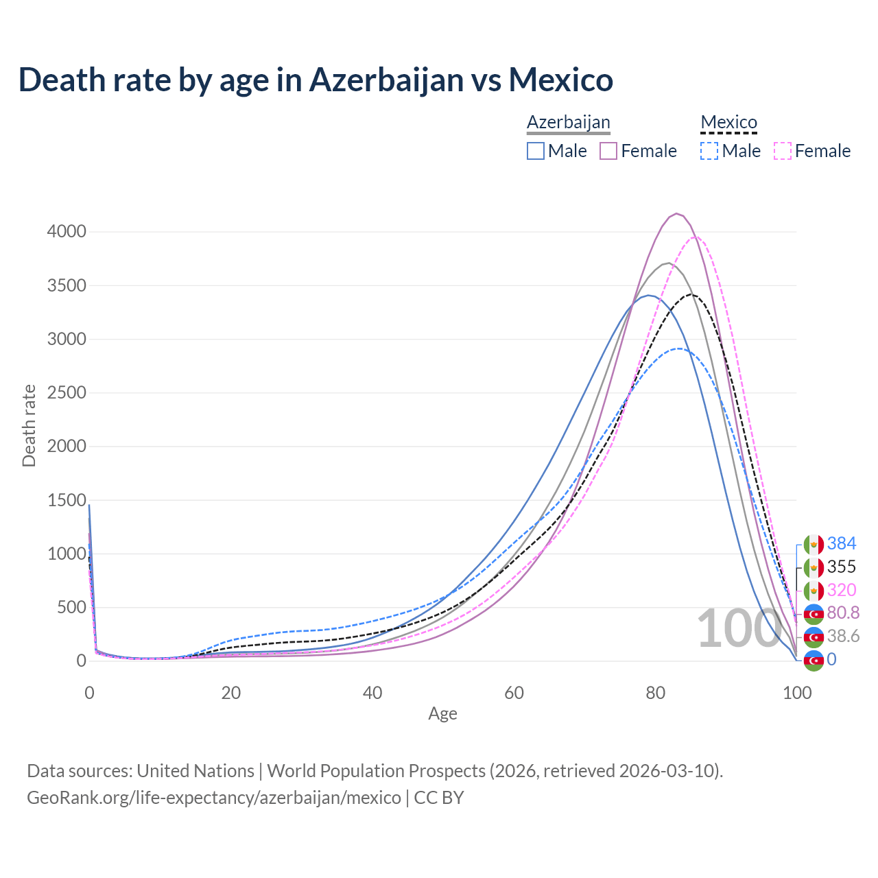 In Azerbaijan, the most common age of death is 82, compared to 85 in Mexico. The median age of death is 78.3 in Azerbaijan and 80.1 in Mexico, meaning only half of each cohort is expected to live past that age.