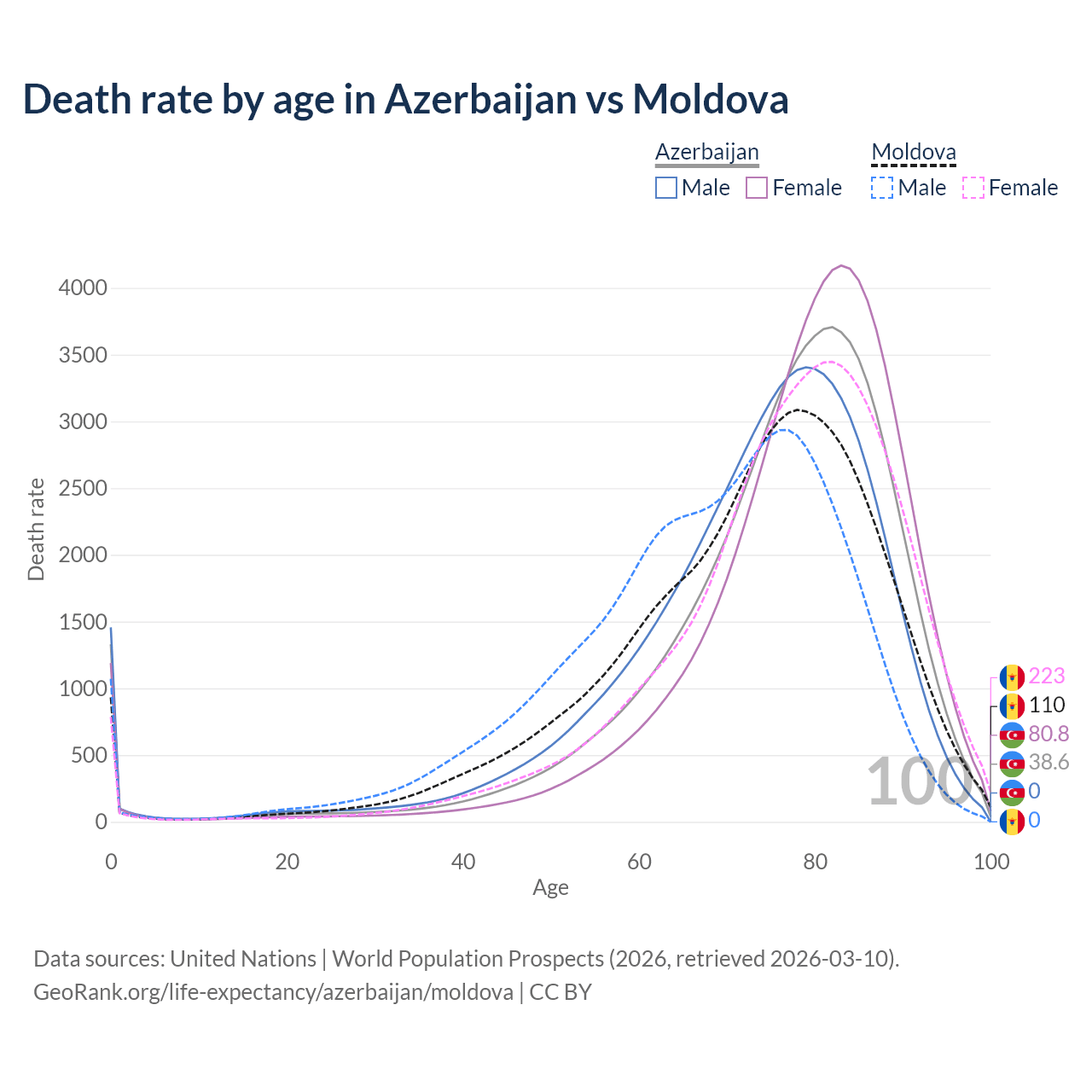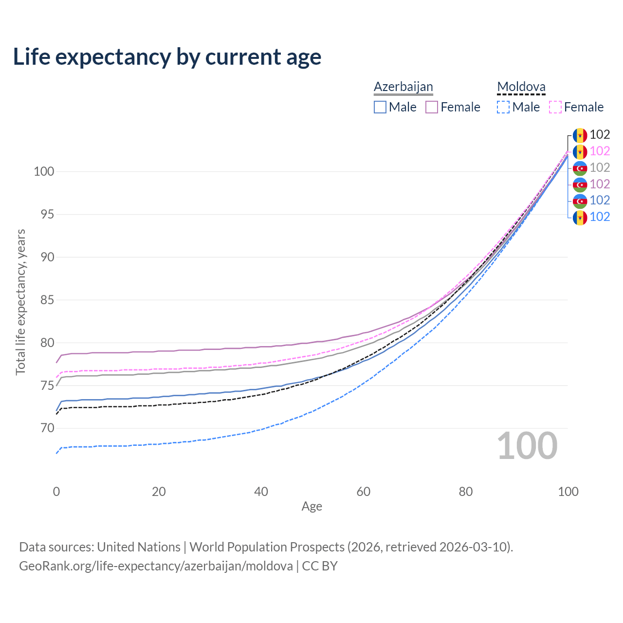 This life expectancy calculator shows the odds of living to 100, 95, 90, and below based on current age for both males and females in Azerbaijan and Moldova, along with mean and median age of death. The calculations are based on the 2026 life tables (actuarial tables) from the UN World Population Prospects.