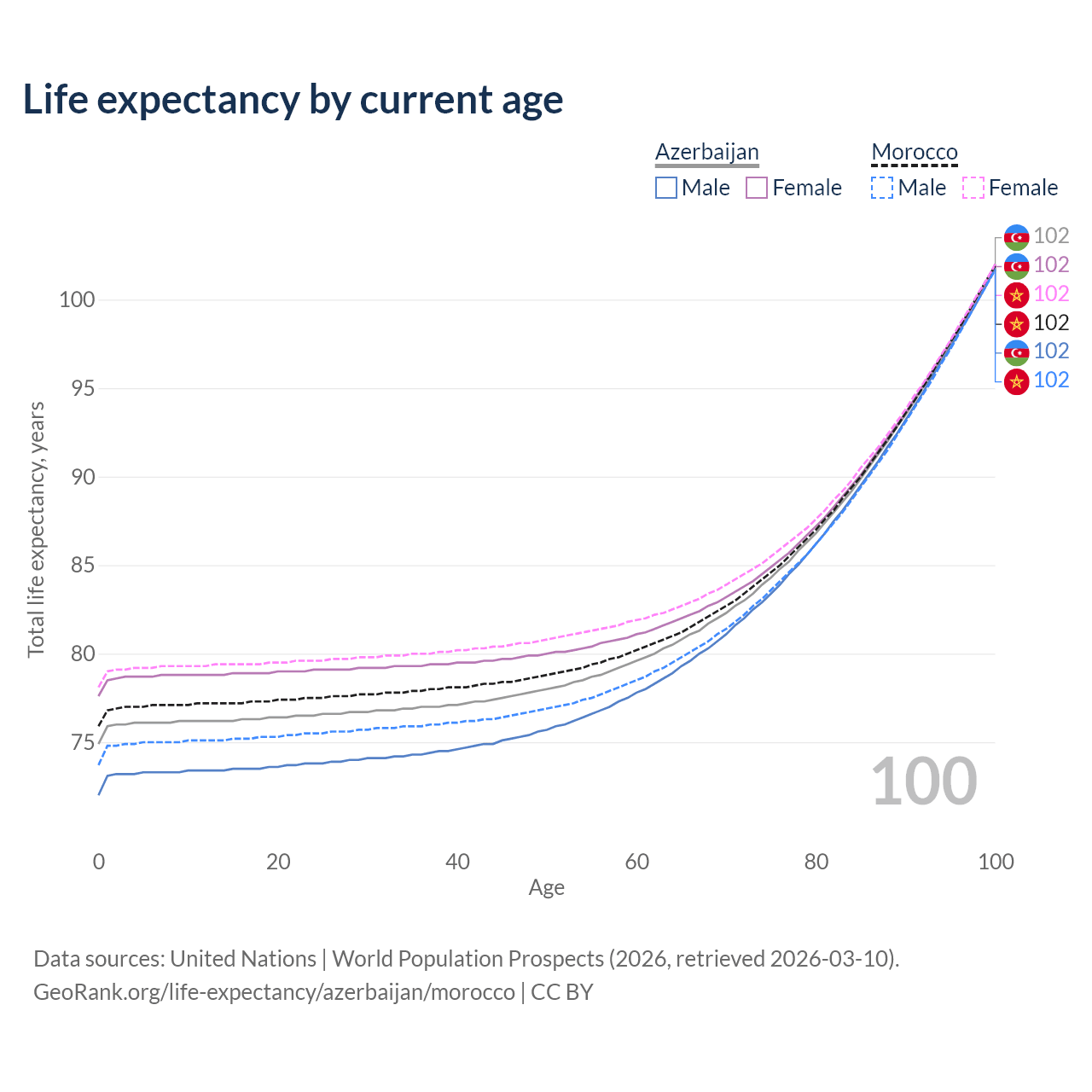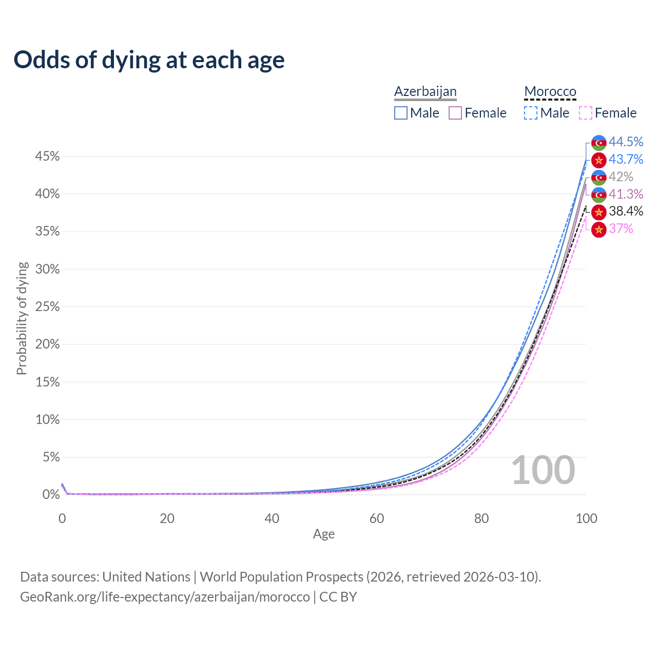 This life expectancy calculator shows the odds of living to 100, 95, 90, and below based on current age for both males and females in Azerbaijan and Morocco, along with mean and median age of death. The calculations are based on the 2026 life tables (actuarial tables) from the UN World Population Prospects.