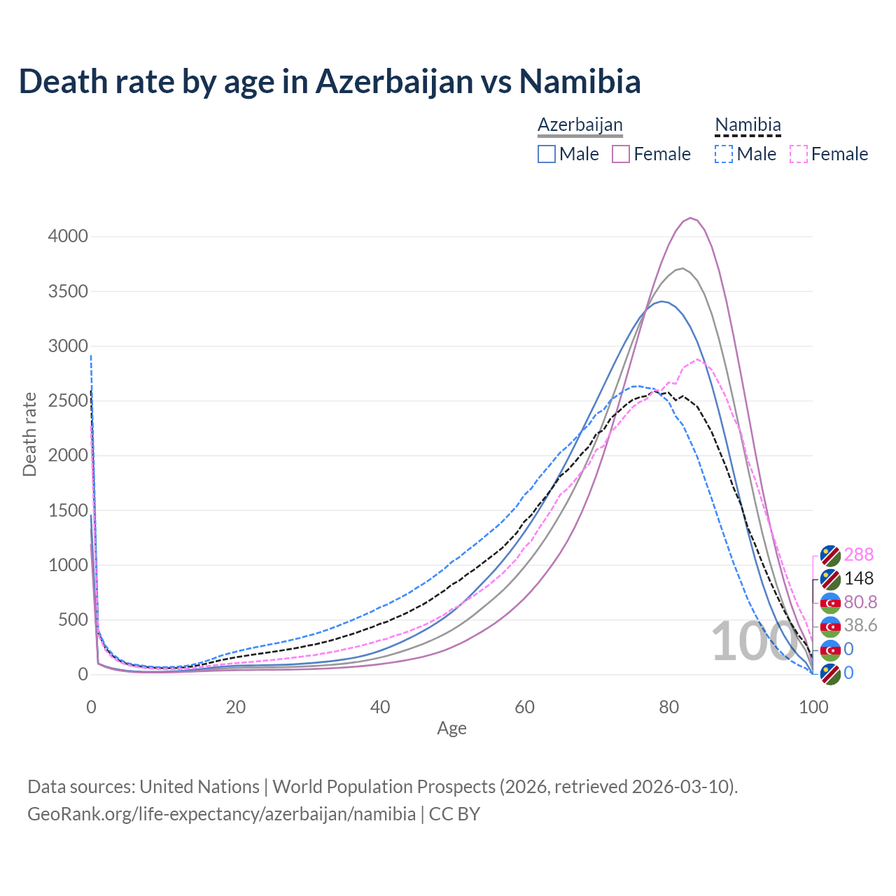 This life expectancy calculator shows the odds of living to 100, 95, 90, and below based on current age for both males and females in Azerbaijan and Namibia, along with mean and median age of death. The calculations are based on the 2026 life tables (actuarial tables) from the UN World Population Prospects.