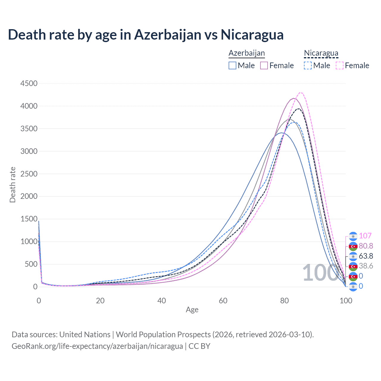 In Azerbaijan, the most common age of death is 82, compared to 85 in Nicaragua. The median age of death is 78.3 in Azerbaijan and 79.9 in Nicaragua, meaning only half of each cohort is expected to live past that age.
