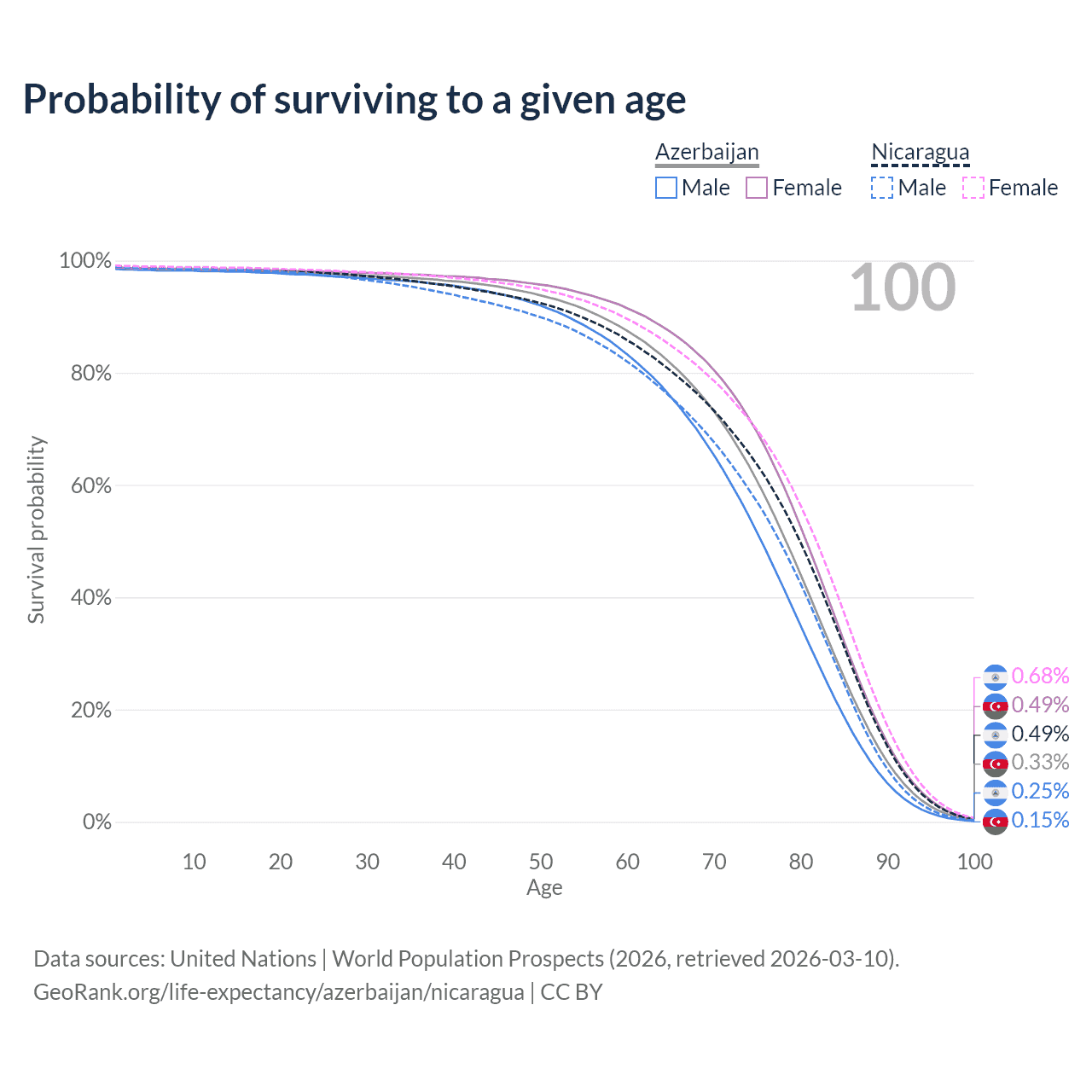 This life expectancy calculator shows the odds of living to 100, 95, 90, and below based on current age for both males and females in Azerbaijan and Nicaragua, along with mean and median age of death. The calculations are based on the 2026 life tables (actuarial tables) from the UN World Population Prospects.