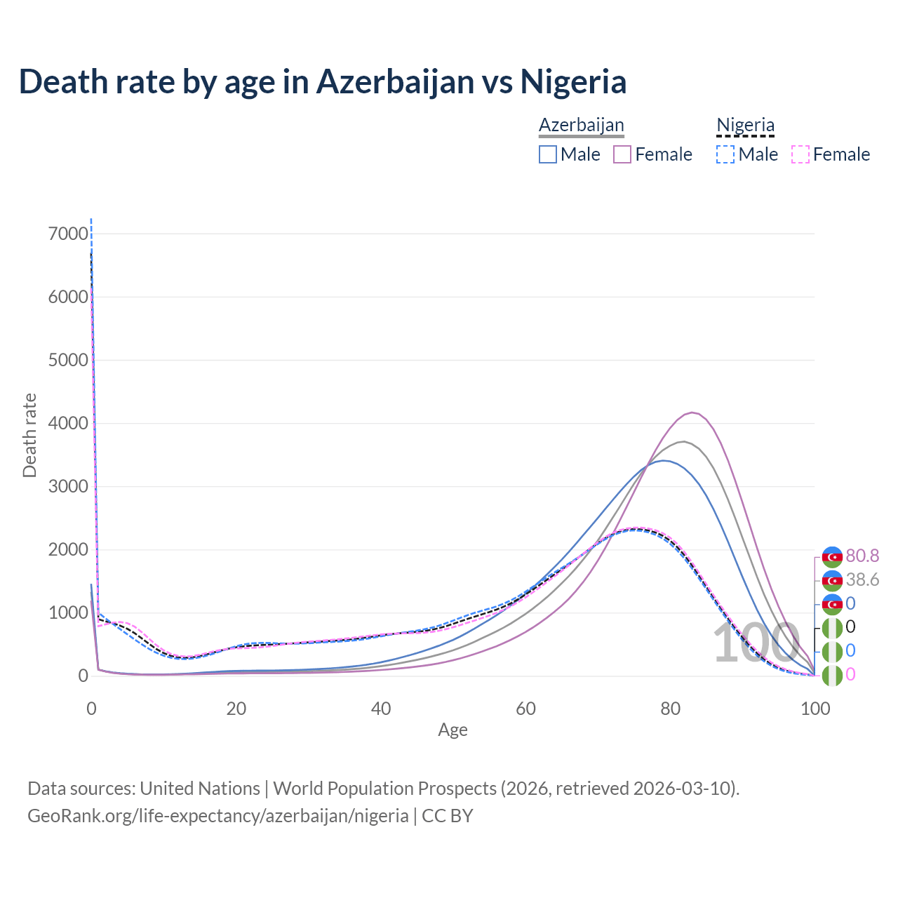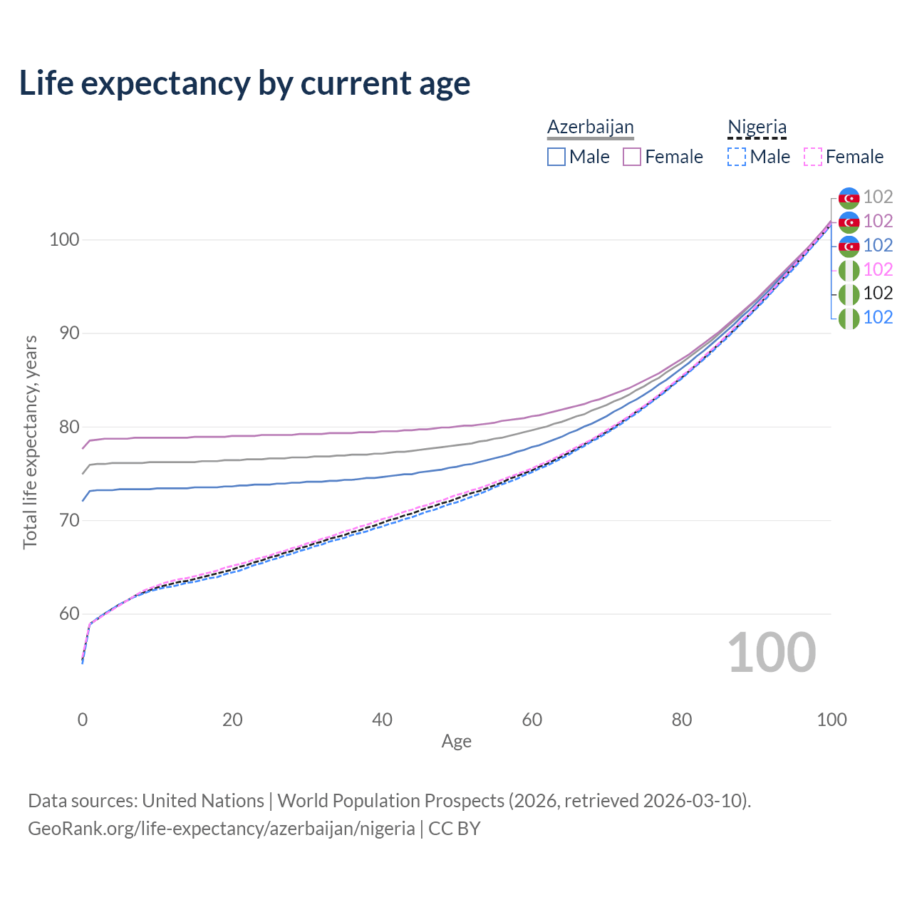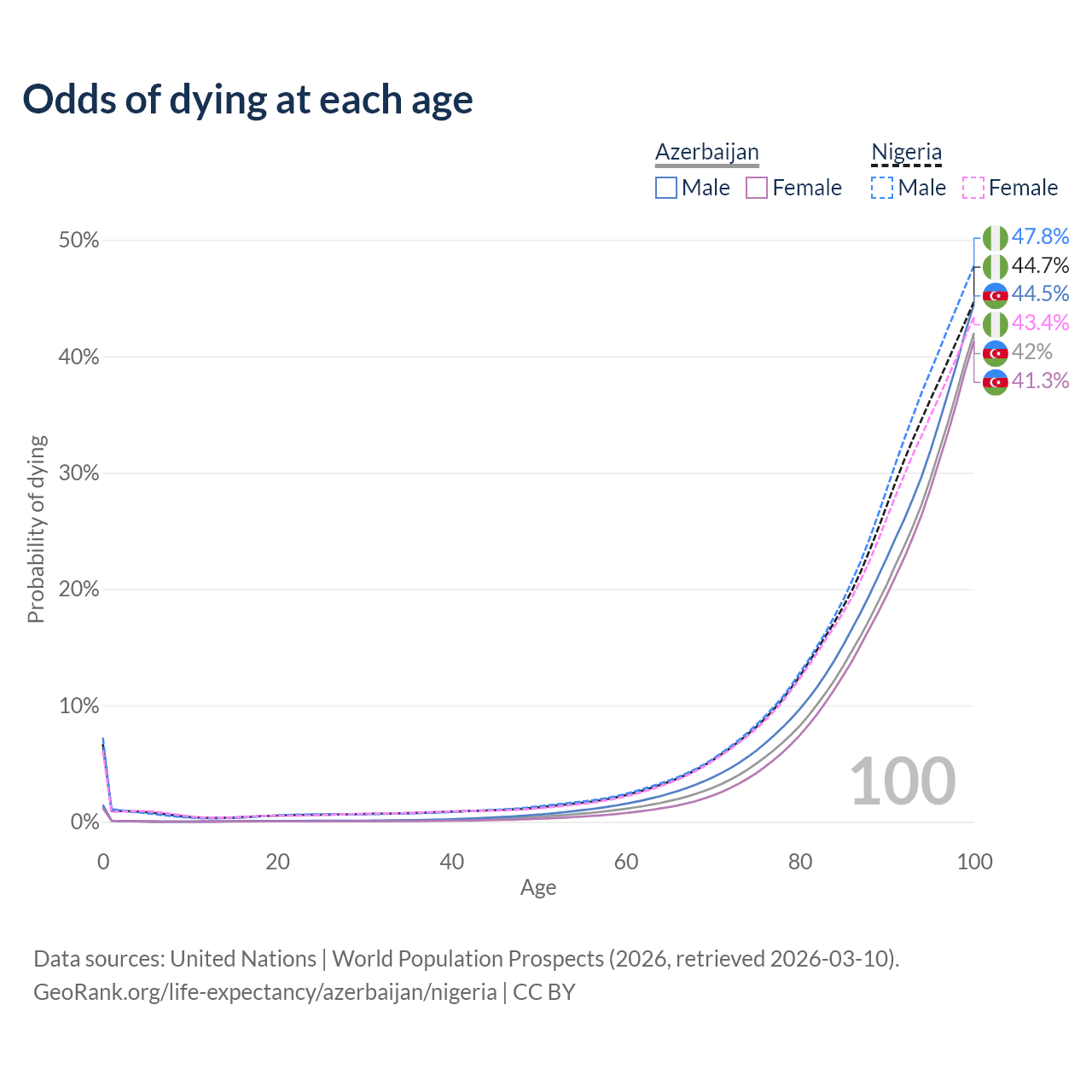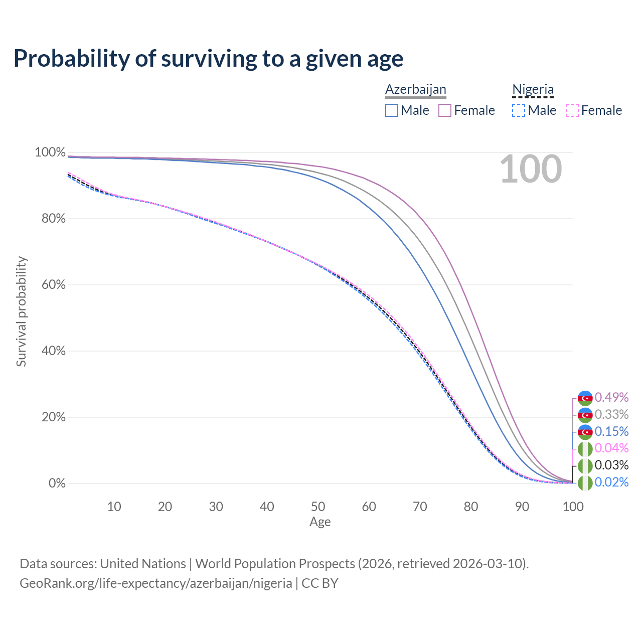 This life expectancy calculator shows the odds of living to 100, 95, 90, and below based on current age for both males and females in Azerbaijan and Nigeria, along with mean and median age of death. The calculations are based on the 2026 life tables (actuarial tables) from the UN World Population Prospects.