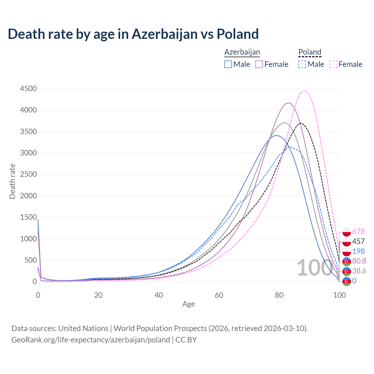 This life expectancy calculator shows the odds of living to 100, 95, 90, and below based on current age for both males and females in Azerbaijan and Poland, along with mean and median age of death. The calculations are based on the 2026 life tables (actuarial tables) from the UN World Population Prospects.